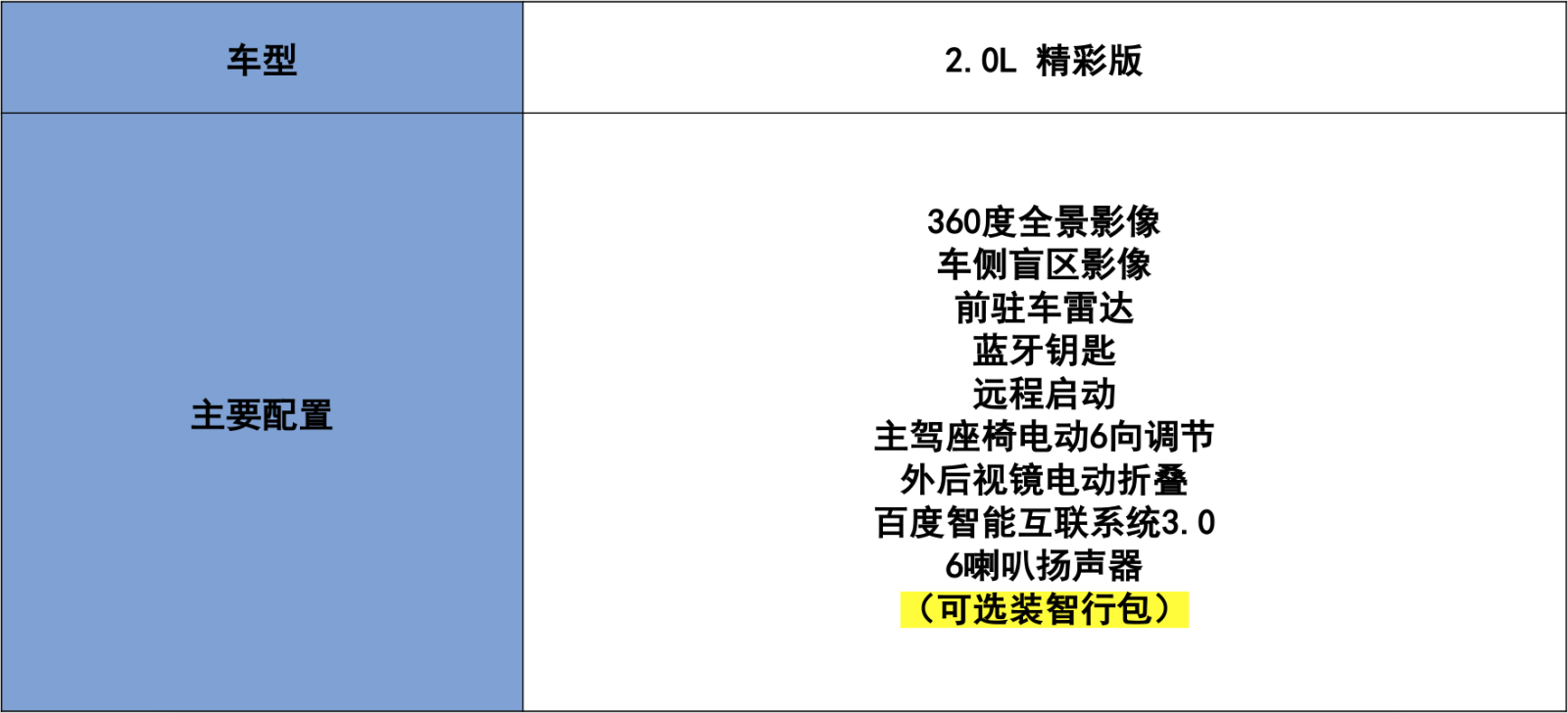这款车型可以看作是2.0L动力的顶配车型,配置有比较大的变化,尤其是高科技配置,有了360度全景影像、车侧盲区影像、百度智能互联系统3.0等等。另外,精彩版车型可以选装智行包,在主/被动安全配置方面会有明显提升。
