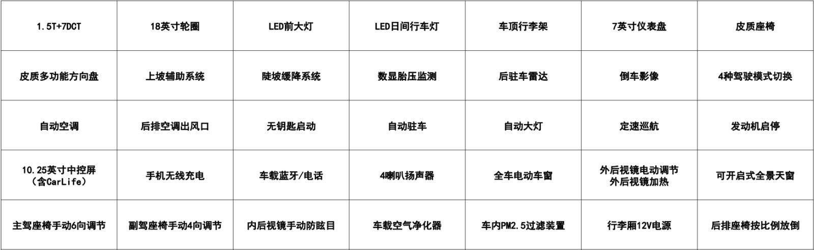 1.5T的顶配车型和2.0L顶配车型的配置基本相同,和2.0L精彩版车型相比仅仅是多了手机无线充电功能。同样的,这款车型可以选装科技包,可以在主/被动安全配置方面有所提升。