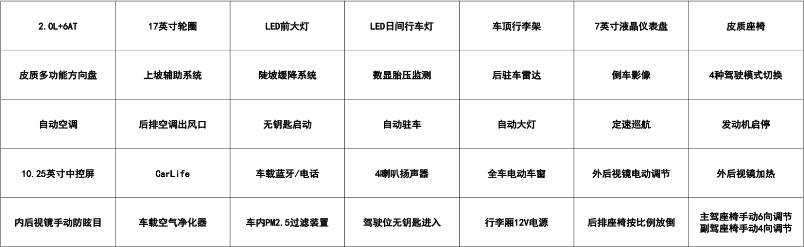 2.0L车型匹配6AT变速箱,最大马力161Ps,最大扭矩193N·m;