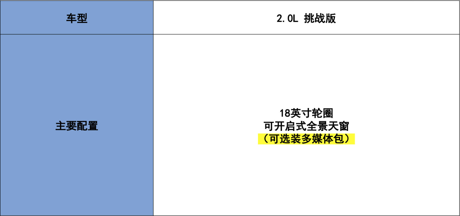 这款车型的配置和入门级车型相比,变化不是很大。主要是升级了轮圈,并且内饰有了可开启的全景天窗。其次,挑战版车型可以选装多媒体包,这样的话中控屏内的功能会变的更加丰富。