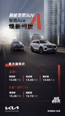 北京时间7月12日,东风悦达起亚智跑Ace正式上市,新车推出两种动力、共5款车型,售价区间为13.98-15.78万元。