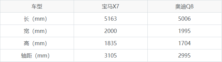 宝马X7和奥迪Q8尺寸/空间对比