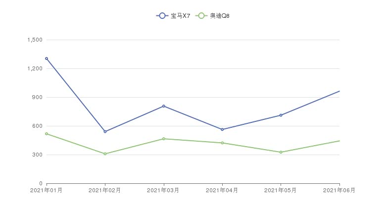 销量往往是购车的重要参考,根据众车网汽车行业数据监测显示,从2021年06月终端的销量来看,宝马X7的销量为962辆,奥迪Q8的销量为443辆,宝马X7要比奥迪Q8多售出519辆。
