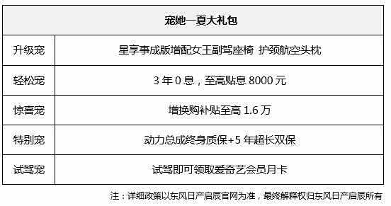 此外,本次上市发布会,东风日产启辰星还推出了超值“宠她一夏大礼包”,包含升级宠、轻松宠、惊喜宠、特别宠、试驾宠五重宠爱好礼:
