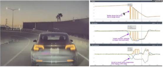 在前车紧急制动的场景下,纯视觉方案没有出现Radar那种信息中断和误判的情况,非常线性,从而能够提供线性的制动决策,带来更佳的使用体验。
