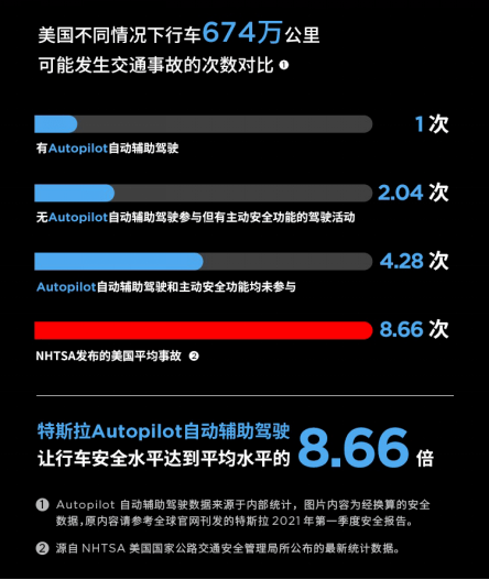 NHTSA公布的最新数据显示,在美国每行车674万公里,平均会发生8.66次事故。而这个数据,在使用了Autopilot的特斯拉车主中仅为1次;没有使用Autopilot但有主动安全功能参与的驾驶中,事故约为2次。也就是说,特斯拉的Autopilot让行车安全水平达到平均水平的8.66倍。