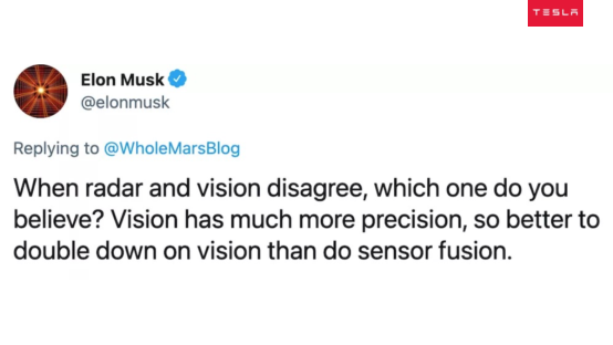 自动驾驶系统,传感器得到的数据是一切的基础,不过不同的传感器各有不同优劣势。对于特斯拉而言,其实取缔毫米波雷达是早晚的事。因为早在2019年的“自动驾驶大会”上,特斯拉就已经公布了一些细节。