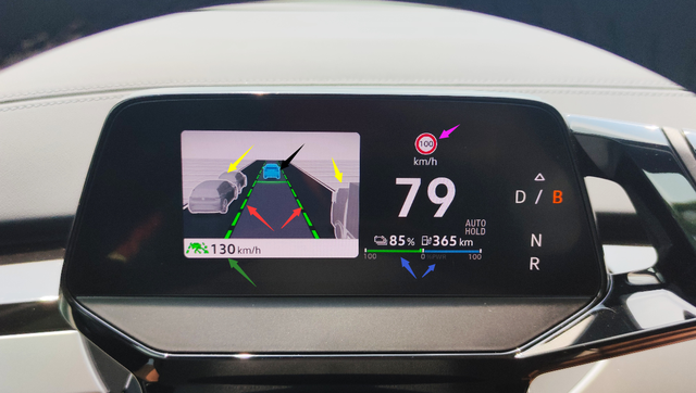 值得注意的是,一汽-大众ID.6 CROZZ配备最先进的IQ.Drive驾驶辅助功能,并与全速域自适应巡航和车道保持功能配合使用,在试驾过程中无论高速路段还是山区跟队路段行驶时都能够较为轻松,并且可以降低行驶电耗。下图为ID.6 CROZZ开启IQ.Drive驾驶辅助功能后仪表盘功能细节特写。