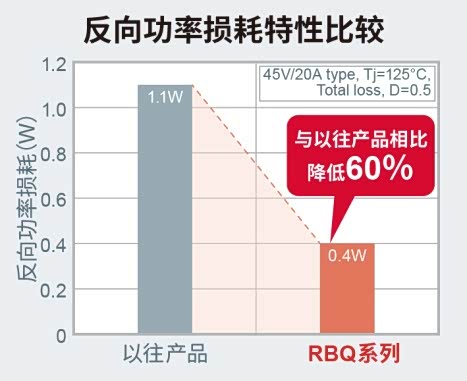 通过采用新工艺,RBR和RBQ系列与相同尺寸的ROHM以往产品相比,效率提高了25%,这两个系列的产品分别具有以下特点: