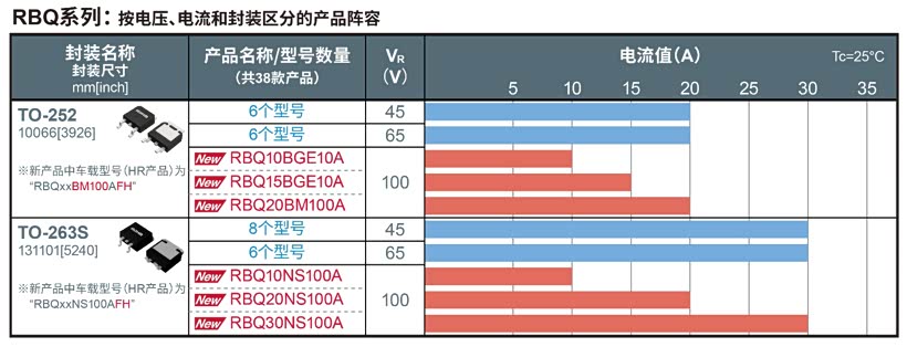 在RBQ系列中,此次新增了12款100V产品(消费电子和车载领域各6款)。至此,包括共阴极型和单芯片型产品在内,该系列已拥有共38款产品的丰富产品阵容(耐压:45V、65V、100V;电流:10A~30A)。
