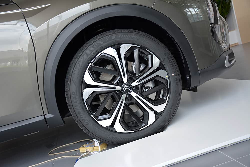 本次实拍凡尔赛C5 X配备了尺寸为205/55 R19的固特异轮胎,与之搭配的19寸花瓣形双色铝合金轮圈造型也很运动。