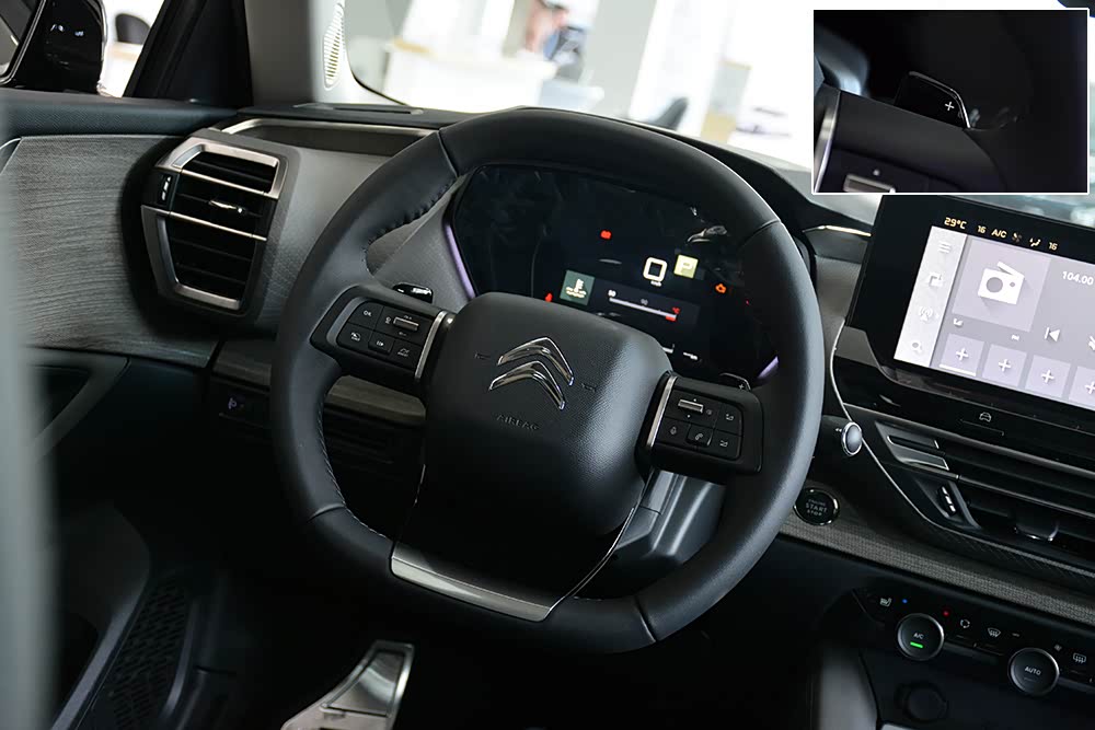 三辐多功能方向盘整体尺寸依旧延续了雪铁龙一贯的小尺寸,皮革包裹与局部镀铬装饰也很精致,功能上除了配备有多媒体控制、驾驶辅助功能外,方向盘还配备有换挡拨片。