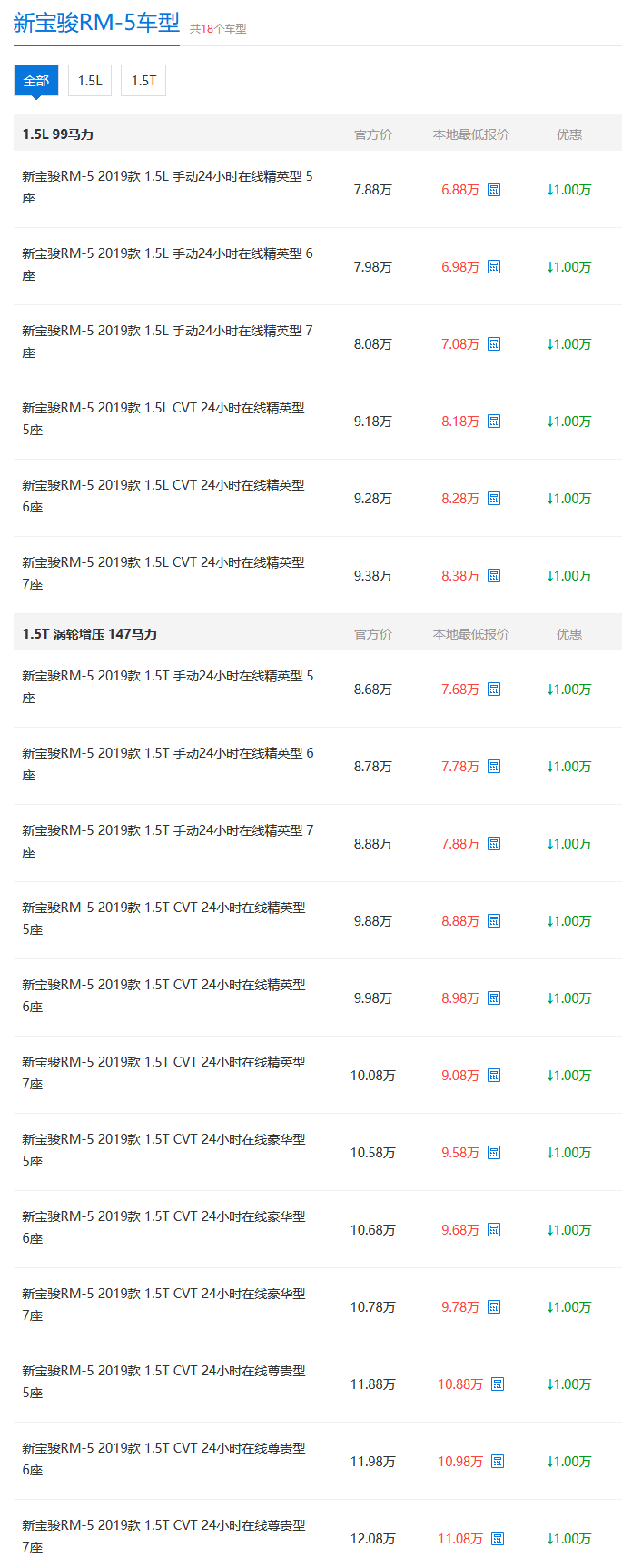 广州地区某汽车经销商近日公布了新宝骏RM5在该地区的优惠行情:目前新宝骏RM5购车最高优惠1万元,6.88万元起售,具体售价信息如下图所示: