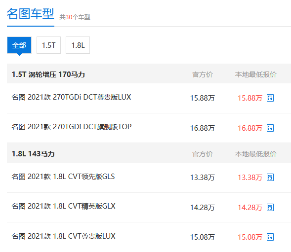 车家号·0浏览·2021-09-01 13:55 · 广西武汉地区某汽车经销商近日公布了名图在该地区的优惠行情:目前名图购车暂无优惠,13.38万元起售,具体售价信息如下图所示: