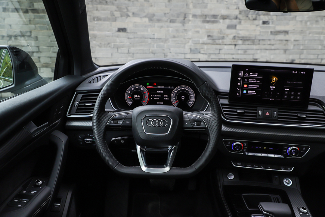 方向盘为平底设计,使用真皮材质包裹,左右两侧包裹的皮质经过打孔处理,更为透气,减少出汗。内饰座舱的做工品质以及用料丝毫不用担心,紧致、清脆的旋钮以及按钮手感是奥迪车型的一贯特色。