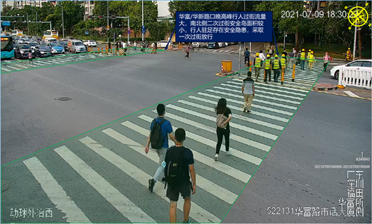 华富/华新路口位于福田区华富街道,路口南北侧虽设有路中二次过街岛,但由于路口晚高峰行人过街流量大,二次过街岛内驻留面积较小,为避免行人驻留路中存在风险,蜀黍也对南北侧的行人采取了一次过街放行。
