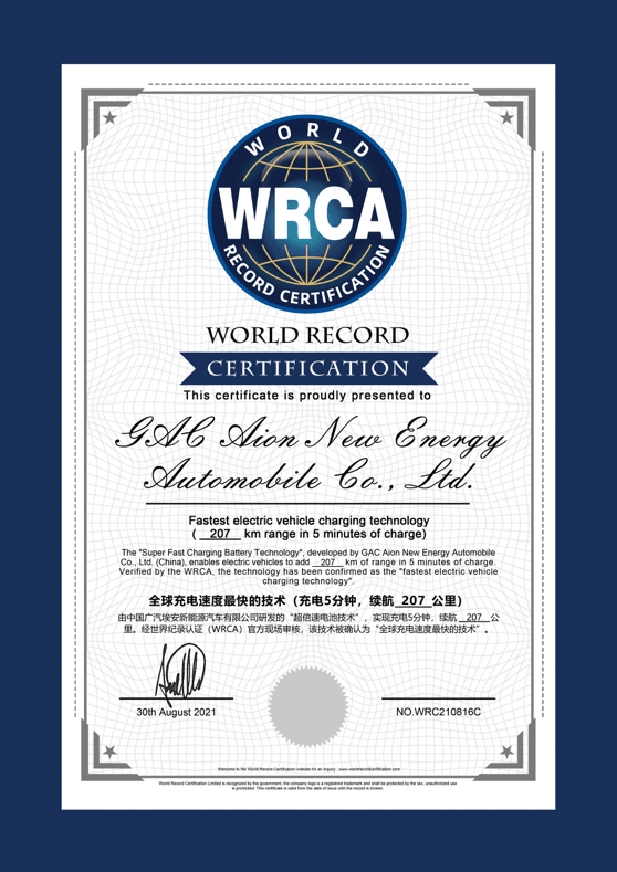 来自SPEED++车队,搭载了超倍速电池技术的AION神秘挑战车成功实现“充电5分钟,行驶207公里”的成绩,并获得了世界纪录认证机构(WRCA)的权威认证。来自全国的顶级专家、主流媒体以及网友,共同见证了“纯电动车充电速度最快世界纪录”的诞生。