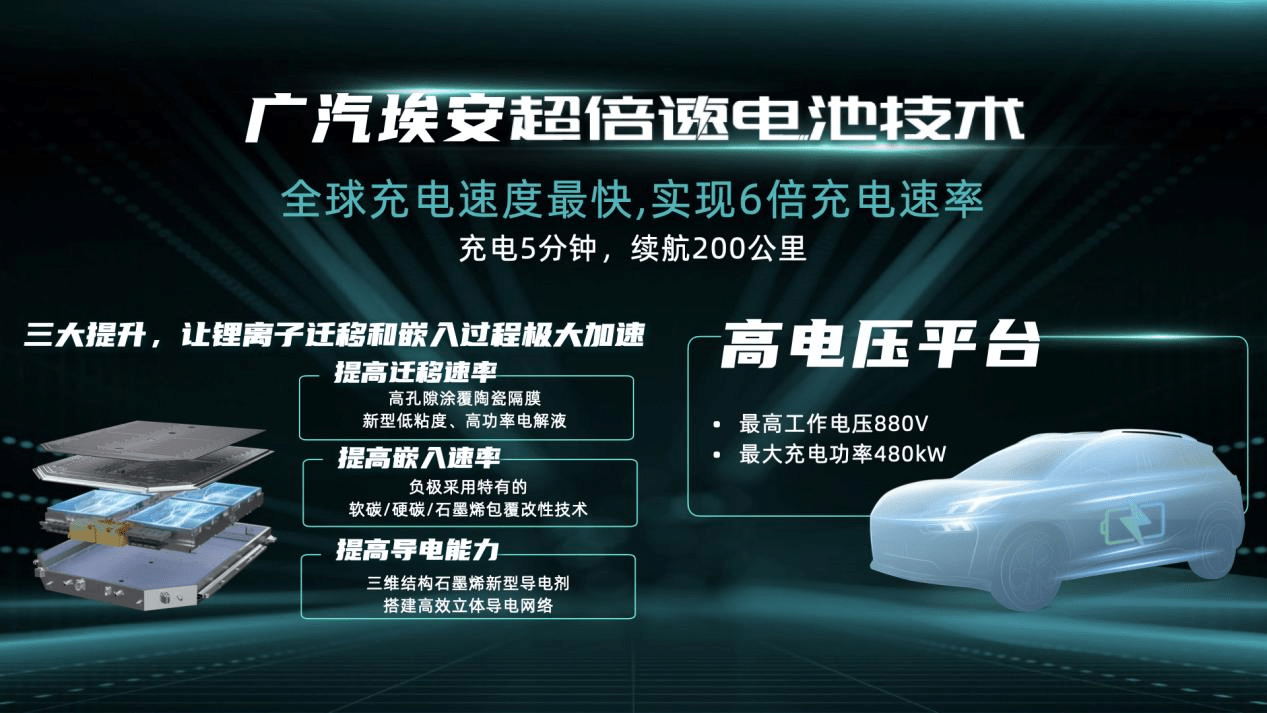 为了解决这两大难题,广汽一方面采用了高孔隙涂覆陶瓷隔膜、新型低粘度高功率电解液、特有的软碳/硬碳/石墨烯包覆改性技术等新型技术及材料;更为重要的是,为了寻找最佳配方,7年内进行了大量的材料配方和工艺设计验证。最终实现了在迁移速率、嵌入速度和导电能力上的全面提升,让锂离子迁移过程极大加速,从而实现超倍速充电。其中,作为导电剂的石墨烯发挥了至关重要的作用。
