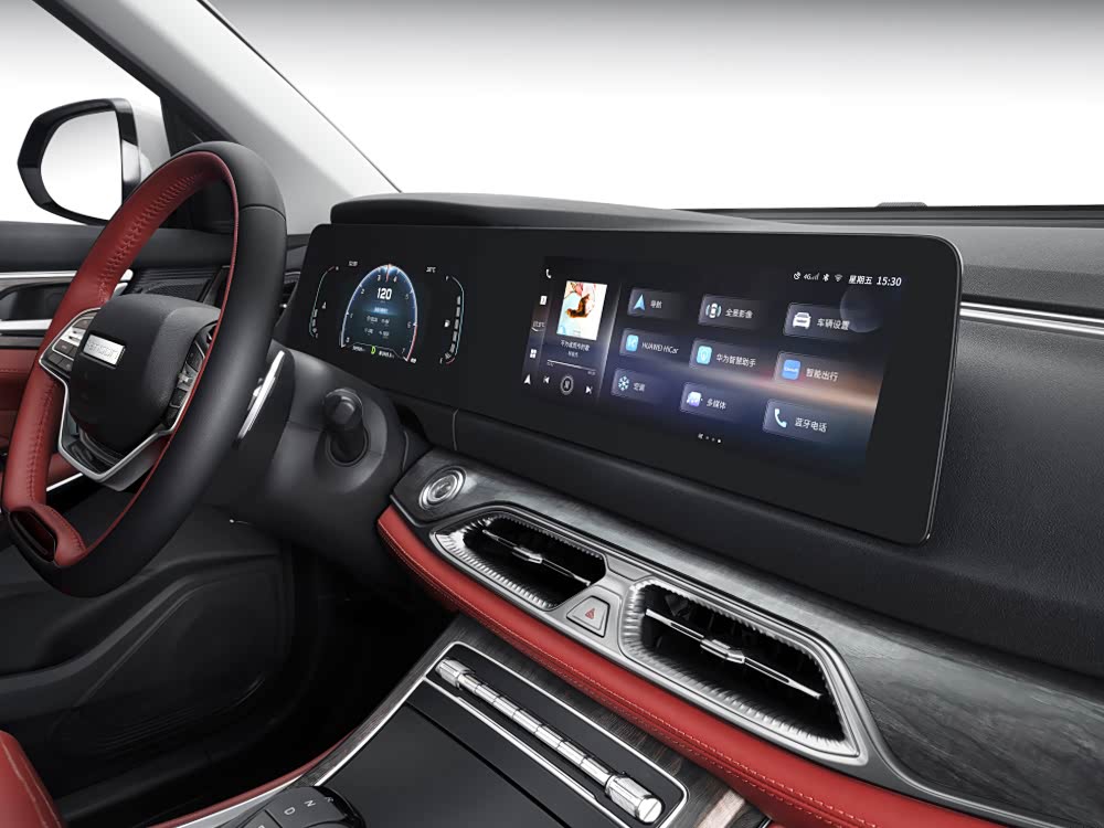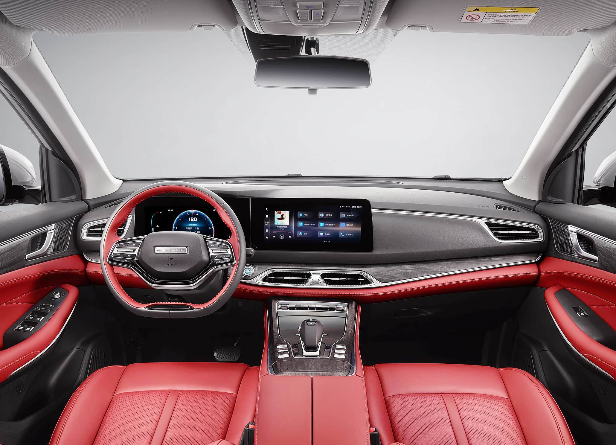 中控台上使用了少量的实体按键,采用了银色的钢琴键造型,看上去很别致,电子式换挡杆也有着不错的精致感。另外新车的内饰使用了红色和黑色搭配的色调,也明显提升了档次感。