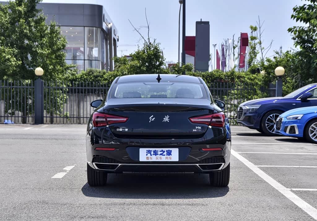 红旗H5的车尾则较为复杂,它的尾灯尺寸比较小,近似三角形的造型也比较新颖。车尾分为明显的上下两部分,下半部分采用了贯穿式后包围,两侧排气口则加上了镀铬装饰边框。这样的设计看上去不够大气,不太符合红旗的品牌定位。