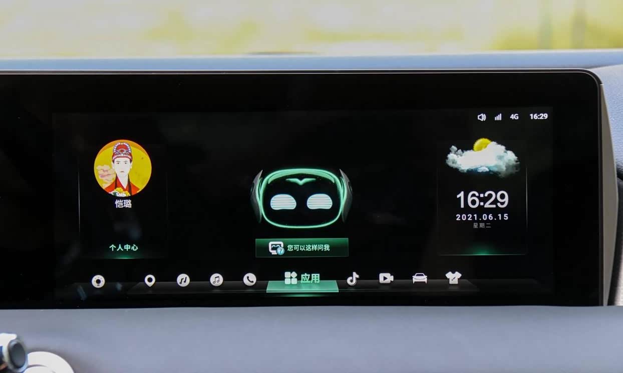 中控大屏,大屏的功能非常之多,首先可以看到的是整个车机系统的主页面,共有三个小页卡,其中左到右分别个人中心、语音模式、天气预报。下方是底层菜单,底层菜单的布置比较合理,比较利于驾驶员在驾驶过程中的操作。