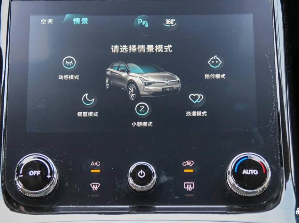 接下来我们说说情景模式的调节,这个比较有意思,目前也有少量新推出的车型有搭载。这个功能主要是用于不同场景下可以快速播放适合该场景的一些音乐。哪吒U Pro 上共有 动感模式、小憩模式、摇篮模式、浪漫模式、陪伴模式五种情景模式可以选择。