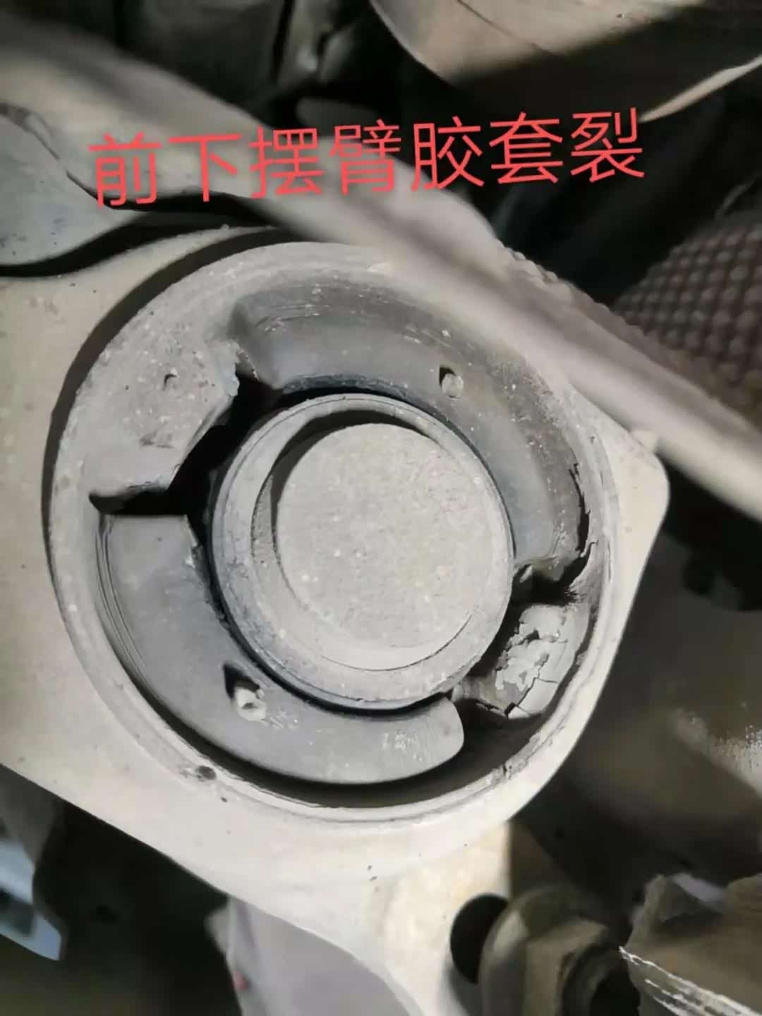 前下摆臂胶套老化开裂,这个位置90%的车到一定年限后都会出问题。