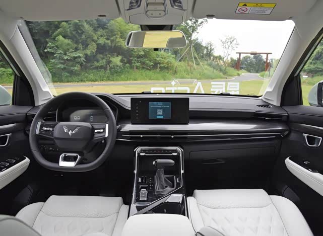 进入车内,内饰同样是中庸路线,整体布局中规中矩,白色座椅和中控台上的仿木纹饰板显得档次感不错,虽然没有全液晶仪表,但显示效果也足够炫酷,10.25英寸中控屏内置五菱最新的Ling OS灵犀系统,提供专属IP形象,增加了不错的科技效果,空调出风口则是贯穿式的设计,搭配上错层设计的中控台,层次感很强烈。