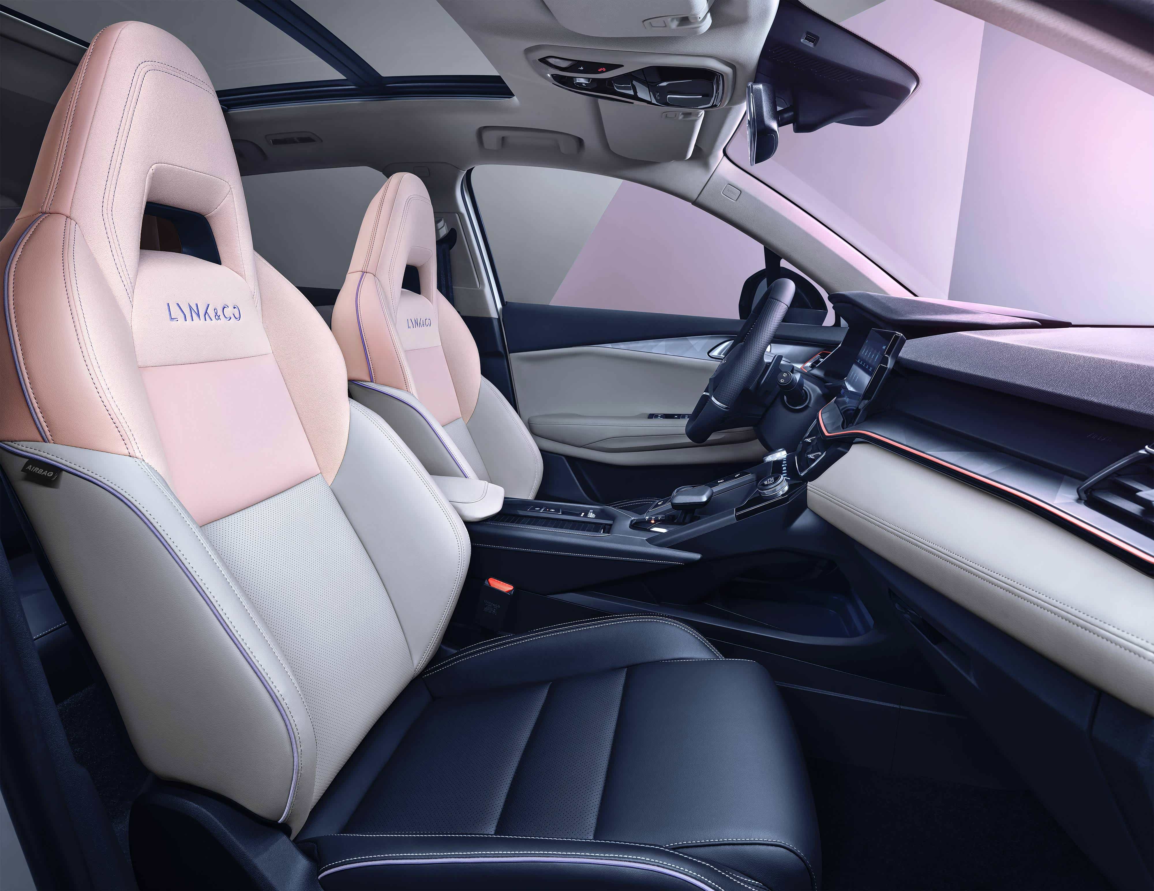 进入领克06 Shero粉色特别版内部,则是代表温和柔韧的氛围。比如,座椅采用粉白拼色,搭配紫色走线,并运用云绒触感的麂皮面料,兼具了乘坐舒适性与视觉美观。