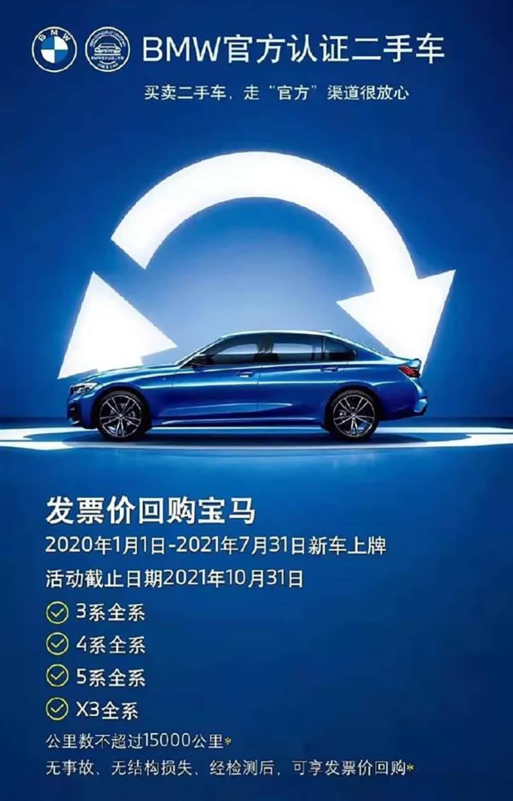 网上传闻,宝马会以发票价回购宝马二手车,回购车型包括宝马3系、宝马4系、宝马5系以及宝马X3,并且要求公里数不超过1.5万公里,无事故和车身结构损失等,同时在上牌时间上也做出了一定要求,为“2020年1月1日-2021年7月31日”的新车,活动截止日期为2021年10月31日。我们可以理解,宝马要回收的车辆也就是我们通常说的准新车。