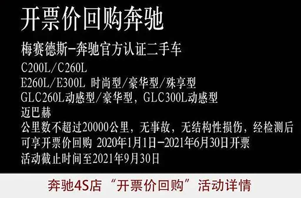 某奔驰4S店对2020年1月1日-2021年6月30日开票的奔驰C200L/260L、E260L/E300L时尚型/豪华型/殊享型、GLC 260L动感型/豪华型、GLC 300L动感型和迈巴赫车型进行回购,也对公里数做出了一定限制,要求不超过2万公里数,同时经检测,要无事故和无车身结构性损伤等。活动截止时间至2021年9月30日。