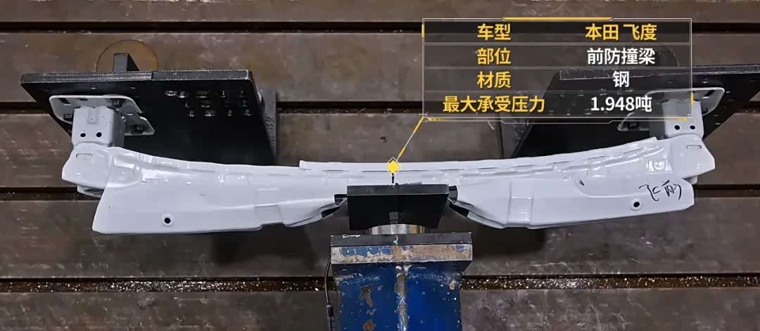 我们再来看看本田飞度的前防撞梁,前部只有一个简单的缓冲铁片,整个前防撞梁的钢材厚度仅为1.3毫米,而前防撞梁能够承受的最大压力为1.948吨。虽然钢材的整体厚度很薄,但是能够承受最大压力的成绩还不算太差。