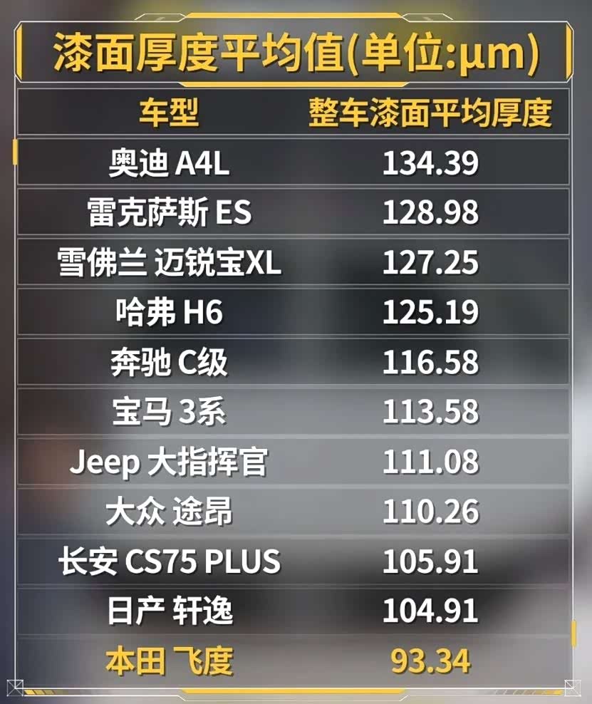 首先是车身漆面平均厚度,飞度的车身漆面平均厚度为93.34微米,在所测车型当中排名垫底。换句话说,就是这辆车的车漆非常的薄,一个简单的小剐蹭,底漆直接就没了。所以这辆车不能经常剐蹭,不能经常抛光。