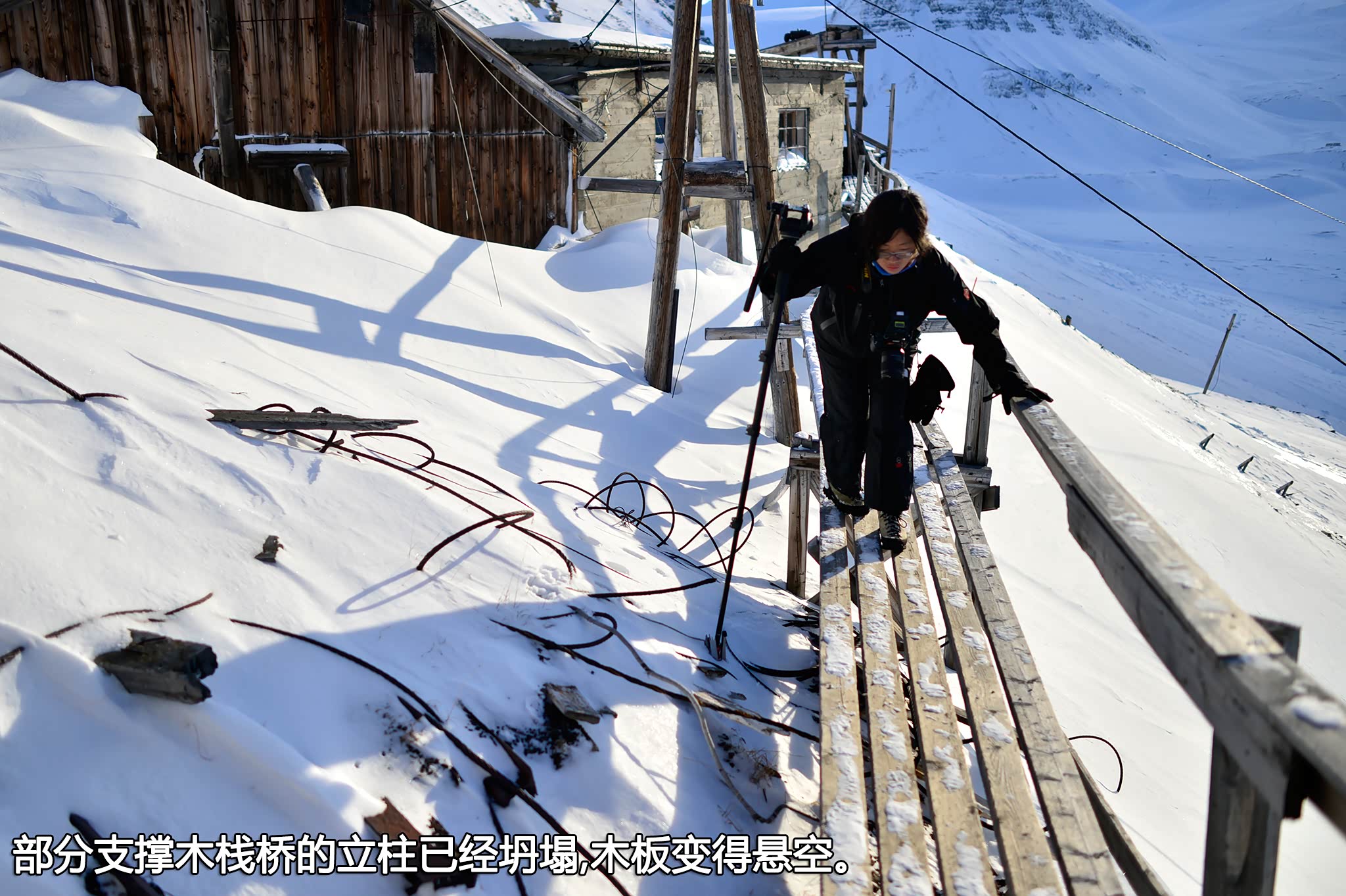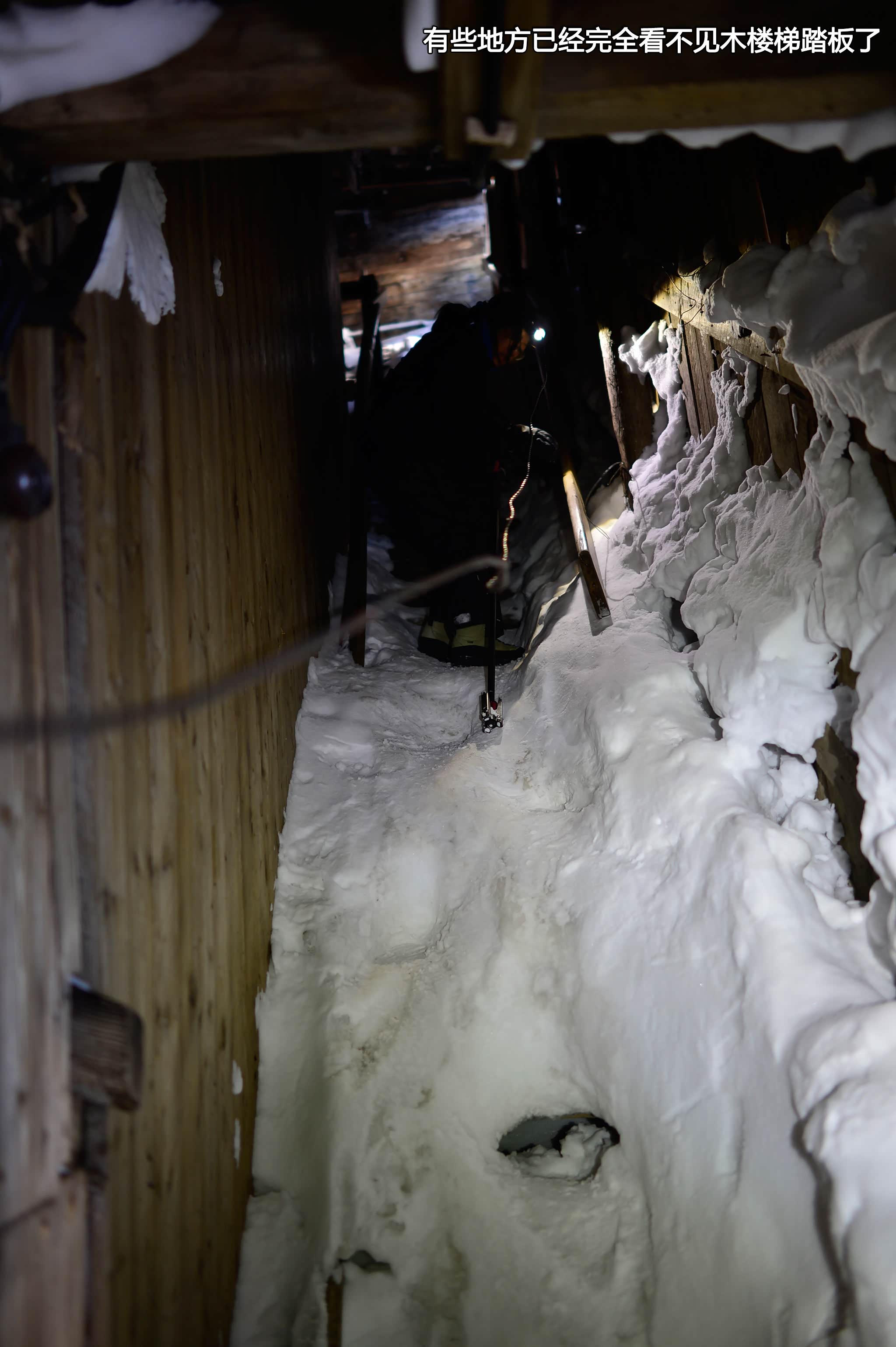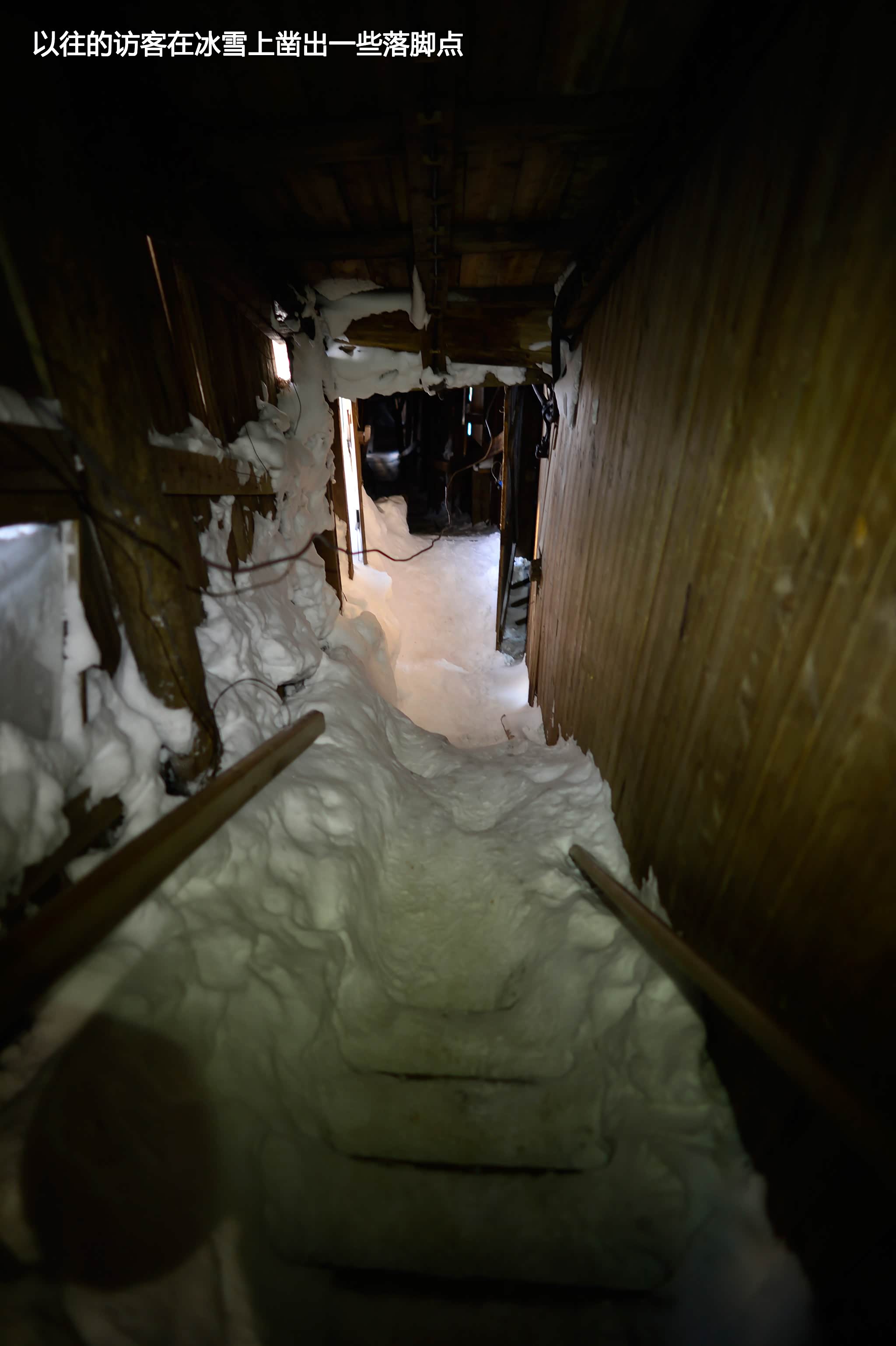 我们向甬道深处探索,有些岔口已经被不知道多少年的寒冰彻底阻塞,膨胀的坚冰将许多木板撑断,我们不得不加倍小心脚下和头顶。在查看某个配电箱时,李佳似乎突然听到不远处有轻微的脚步声,她冲那个方向喊了两声”Hello”,但无人应答,我们站下来仔细倾听,片刻后我也听到了脚步声,于是我也冲那边喊道“这里有人吗?”依然没人做声,我让她留在原地,握紧手里的雪杖,我硬着头皮朝那边探去。