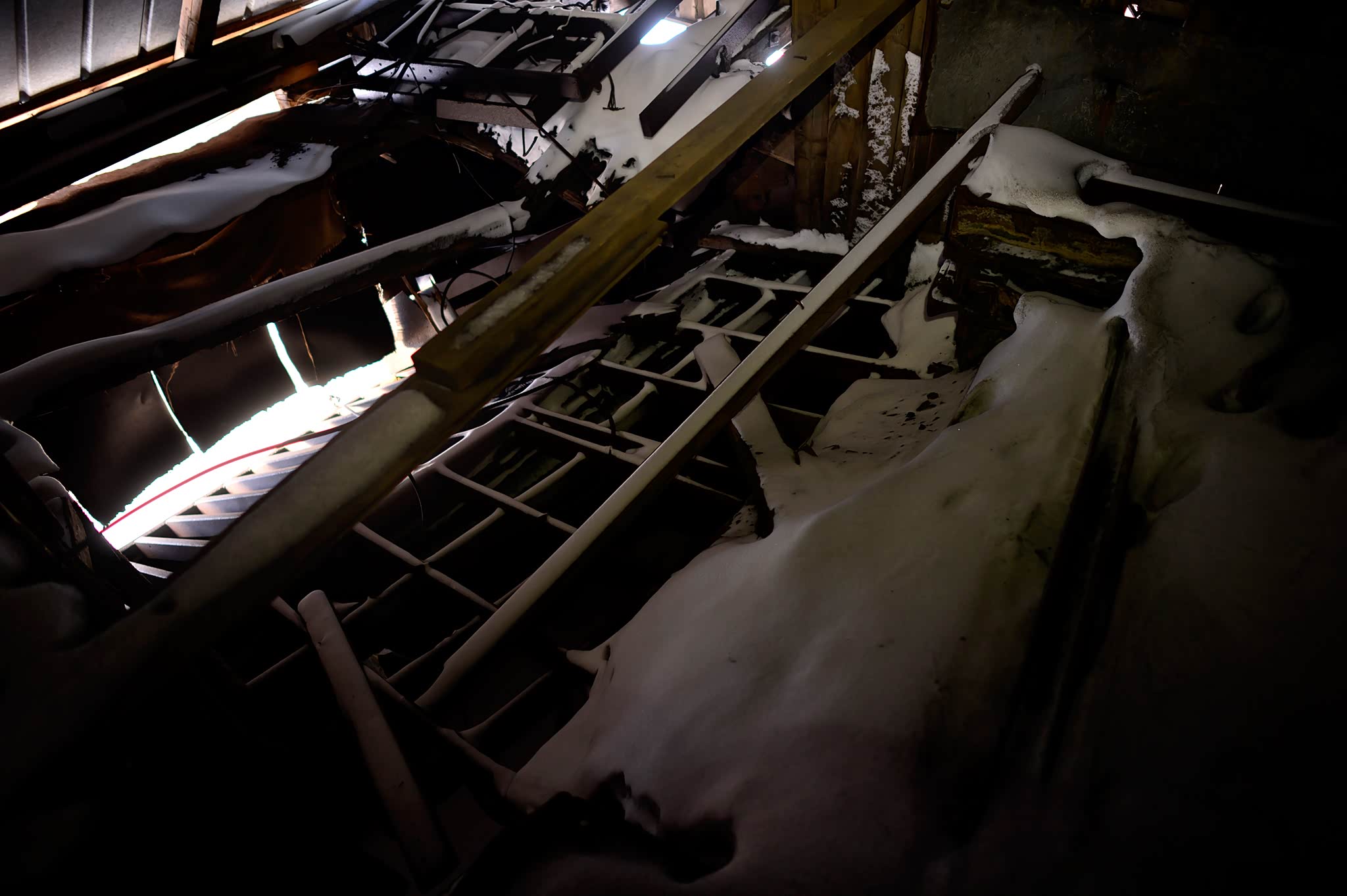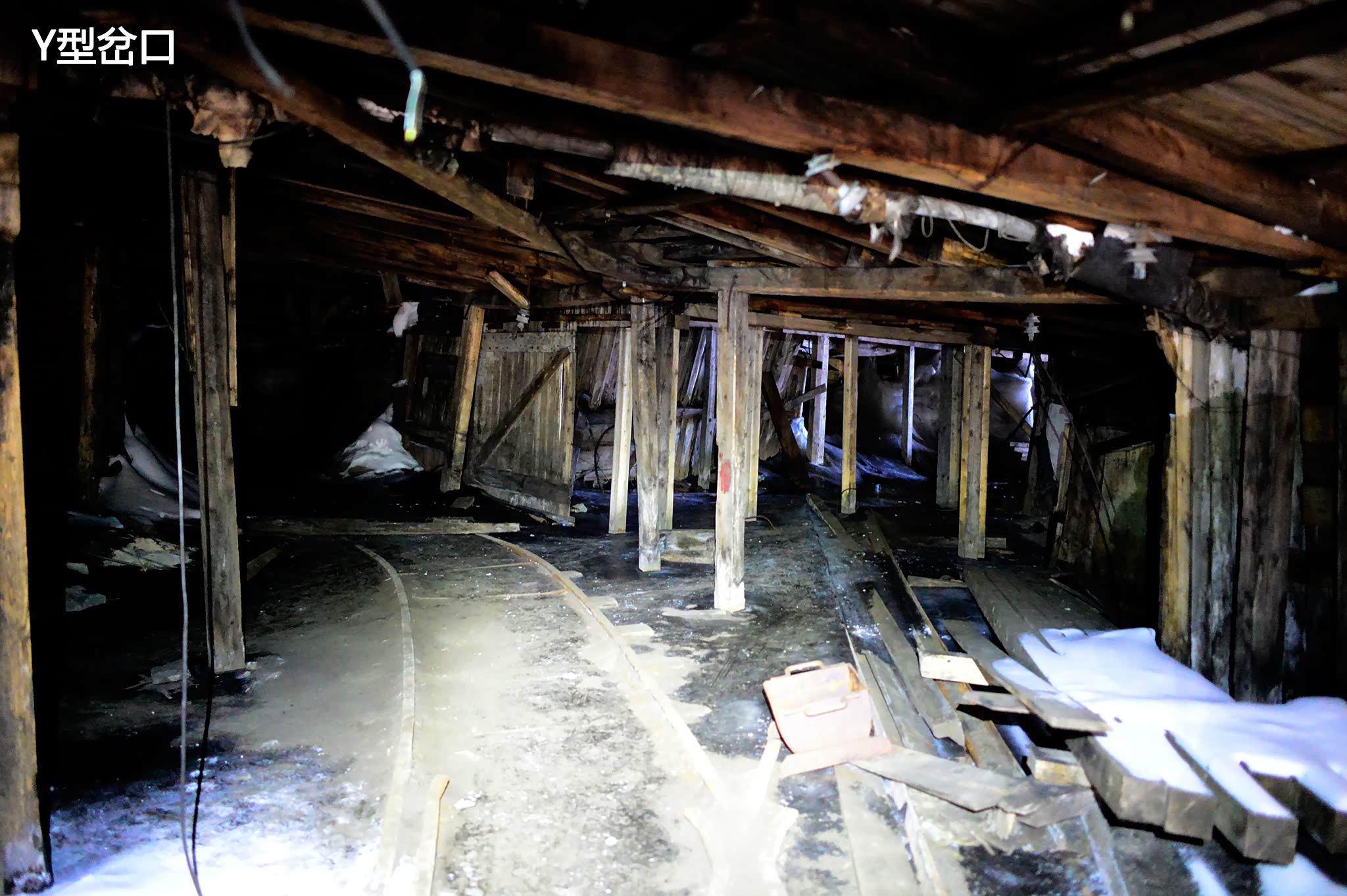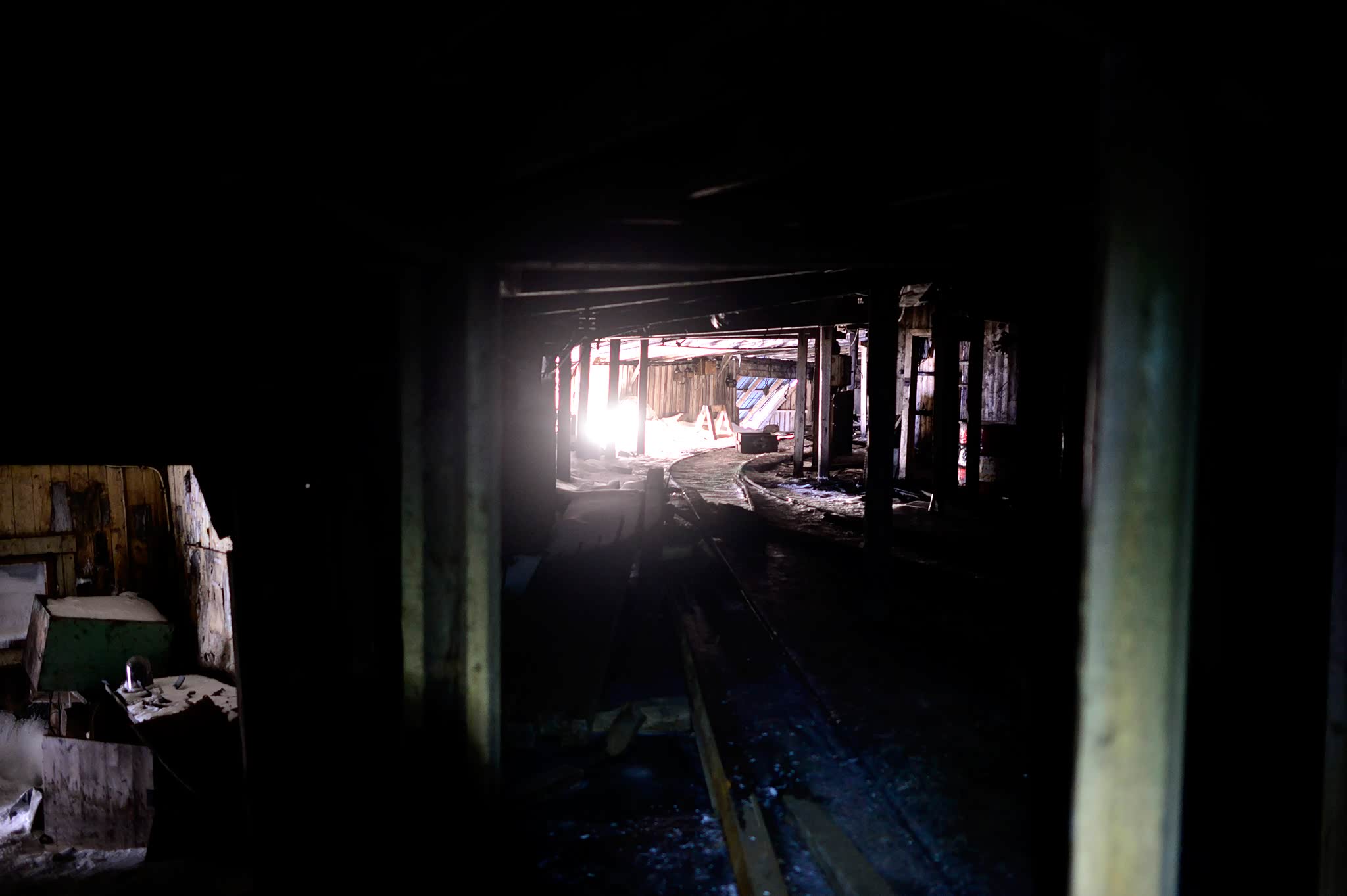 木栈桥尽头的入口内呈L型,正前方是往下层的楼梯,右边通往矿洞上层,我打开Petzl头灯,将亮度调至最强,进入矿洞不远,我们已被黑暗吞噬了,头灯是我们探索前行的唯一依仗。通道地面铺着铁轨,这应该就是当初运煤车的轨道,附近的磅秤平台已经坍塌,远处有的通道立壁多处破损,透出了外面的阳光。我们顺着铁轨往远处走,不久发现这一端的甬道顶部已经坍塌,厚厚的积雪阻挡了我们探索的可能。