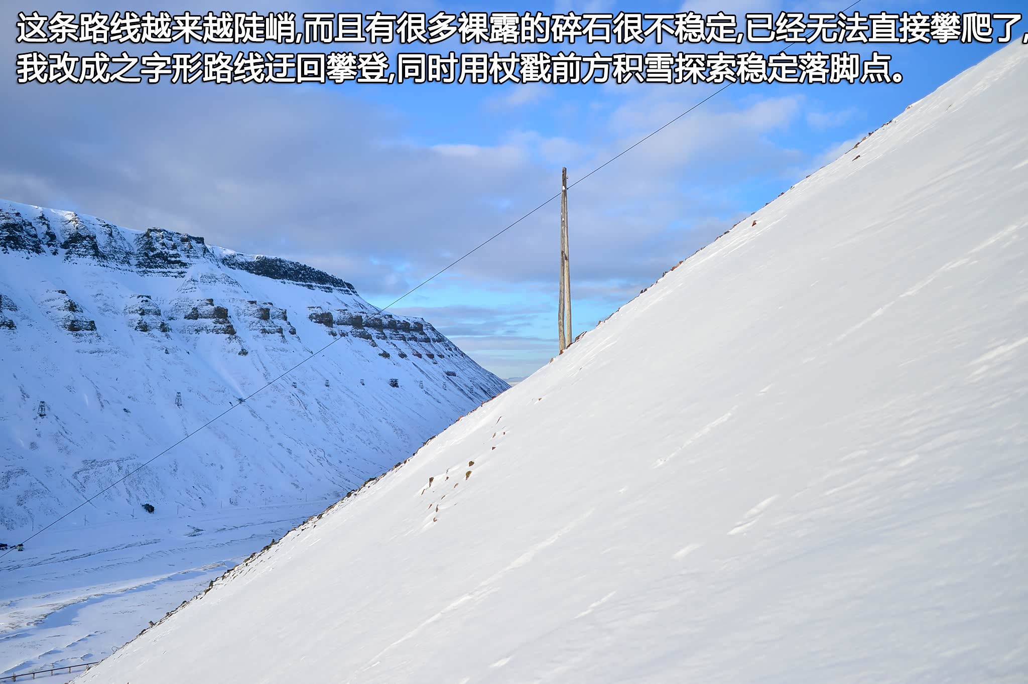 客栈位于矿洞的西南方向,我们没有做过多探索就选了条较直的路线朝矿洞方向登去,但不久后就发现这条路线越来越陡峭,而且有很多裸露的碎石很不稳定,我走在李佳的前方探路,随着坡度的提升很快我不得不采用之字行进路线。表面看起来一样的雪层下面有许多石头,如果踩在那个上面就会打滑,幸好带了滑雪杖,不停地戳前方,探索出较稳固的落脚点。