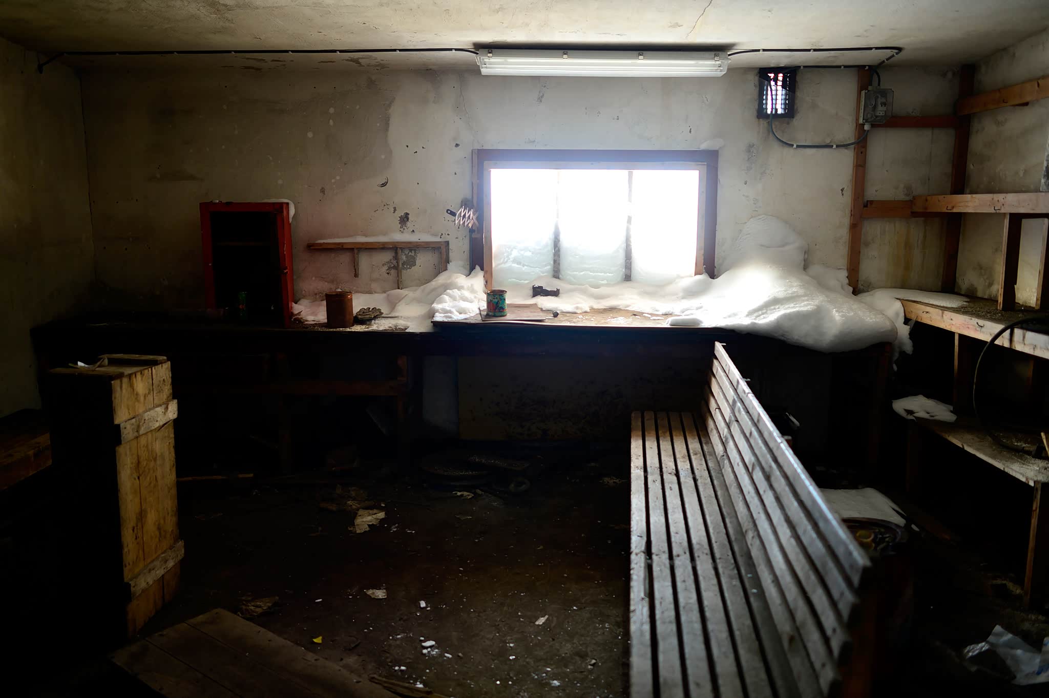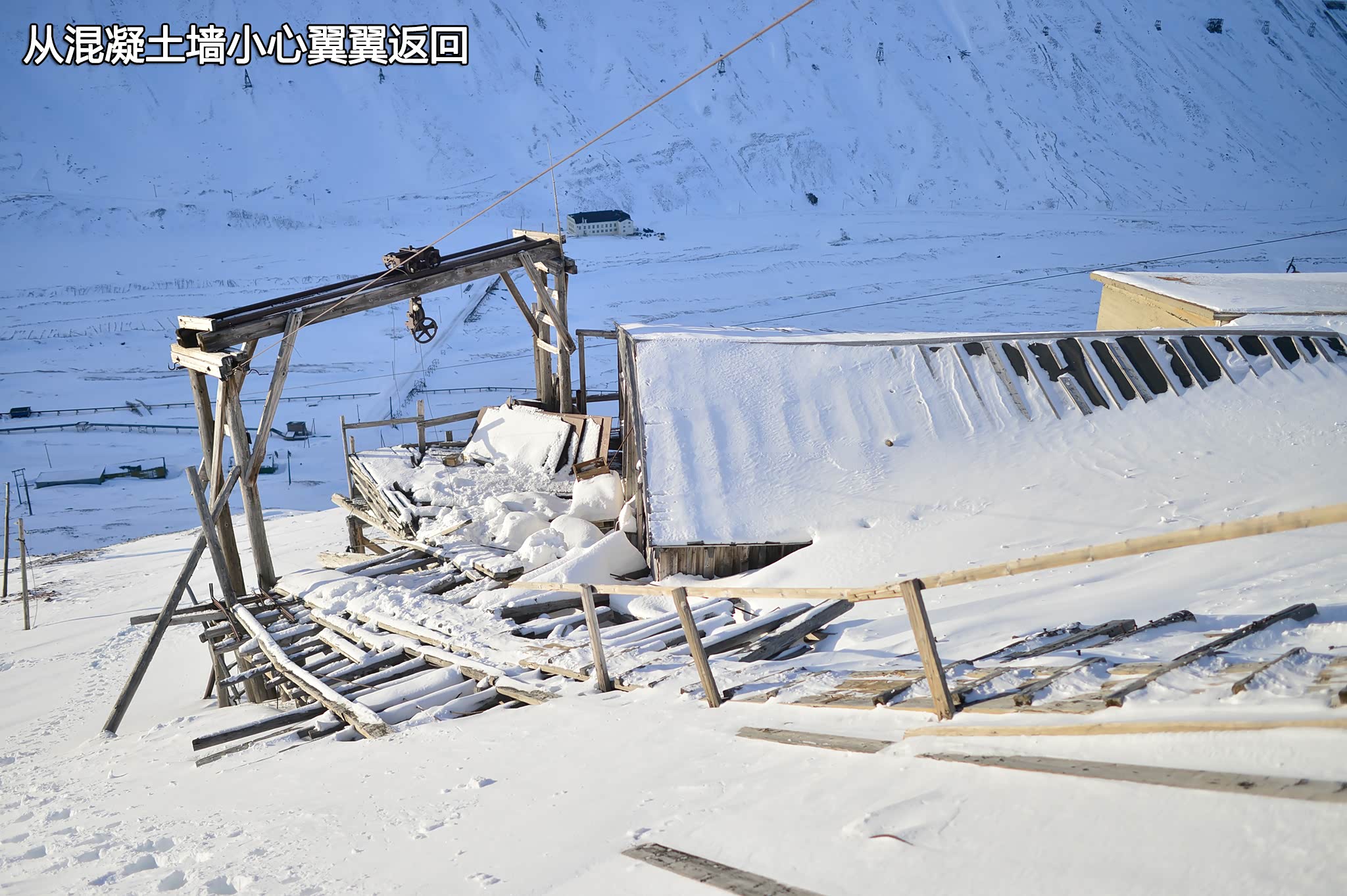 南侧入口这边有些带窗户的房间,有的房间像是曾用来休息更衣的地方,有的房间则配有大型绞缆机,部分地方已经坍塌,经年的寒冰将其深深的掩盖。地上时而散布着木条,我小心翼翼的跨过防止踩到上面的钉子,视线所致,到处涂画着各种文字,也许跟长城上一样,这些是国际版的到此一游。