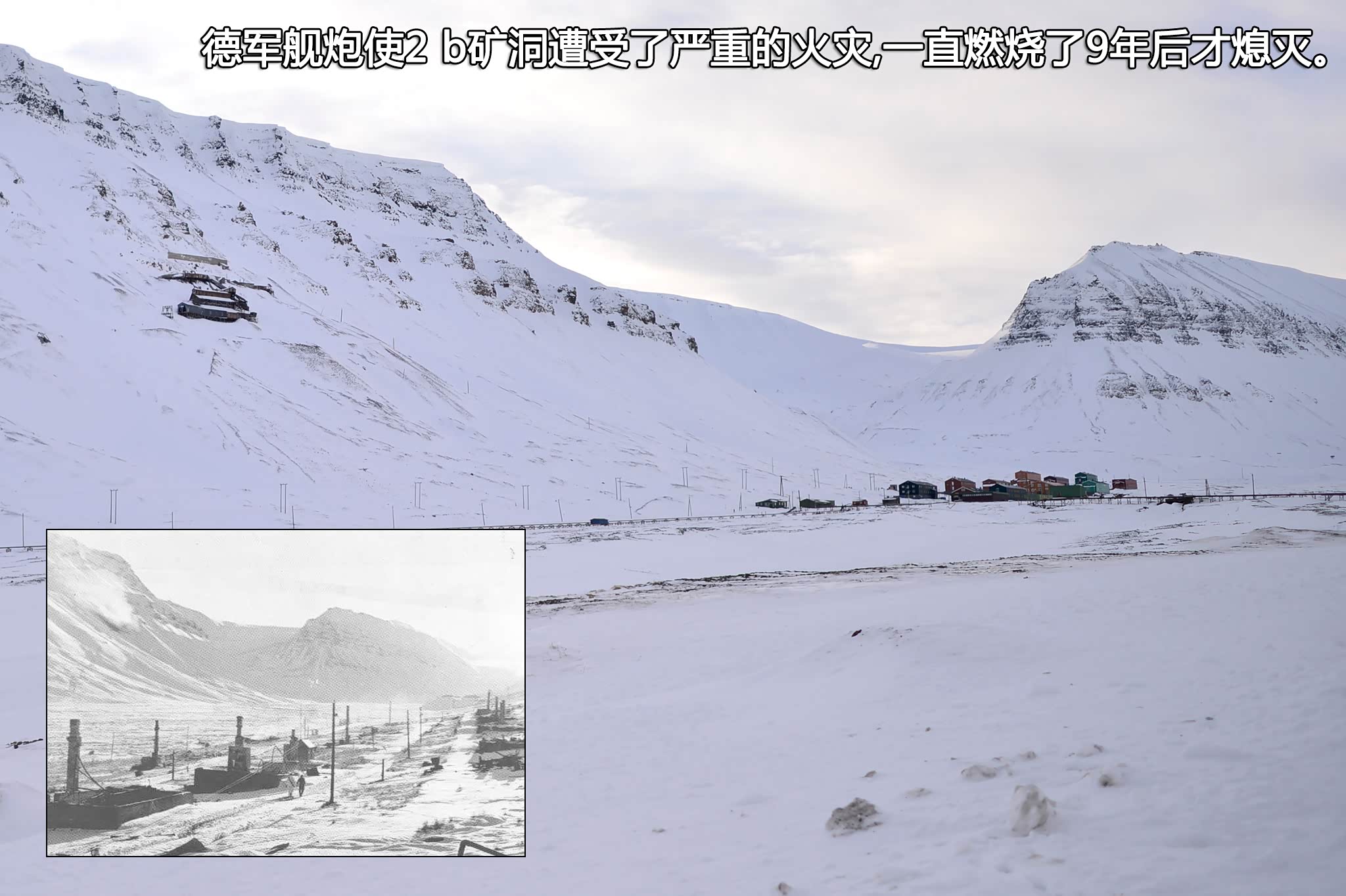 客栈后方不远的半山腰上有一个废弃多年的2 b号矿洞,它从1937年开始运营,1968年关闭。这里俗称圣诞老人矿洞,朗伊尔的孩子们传说圣诞老人居住在这里,所以每年圣诞节孩子们都会将愿望清单投进矿洞山下的邮筒内。1943年9月7日,应希特勒的私人要求,德国海军实施了“Operation Zitronella ”西西里行动,战列舰Tirpitz提尔皮茨号和战列巡洋舰Scharnhorst沙恩霍斯特号率领9艘驱逐舰攻击朗伊尔,提尔皮茨号是俾斯麦级战列舰的二号舰,是纳粹德国建造过火力最强的战列舰,但俾斯麦号被击沉后被限制出击,所以这是提尔皮茨号52倍38厘米口径主炮唯一的一次射击地面目标,朗伊尔几栋木质建筑和气象站被击毁,2 b矿洞遭受了严重的火灾,一直燃烧到1952年才熄灭。