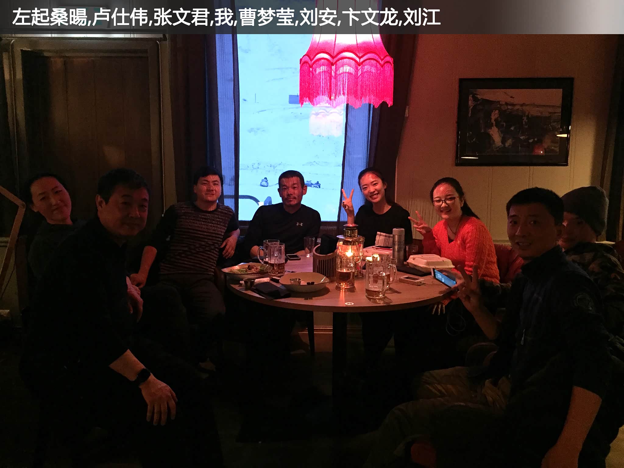 说起来很巧,桑暘每年都会带一些中国学生到访朗伊尔,这次是专门带她先生来观光。于是朗伊尔的最后一晚我们一起共进晚餐,当天还遇到两位来旅游的中国女孩,她们是在英国考文垂大学的留学生曹梦莹和刘安,这也许是当时在朗伊尔的所有中国人了。后来听说我们刘大导演的胃口受不了天天汉堡披萨,这个吃货跑去找女学生要国产方便面去了。