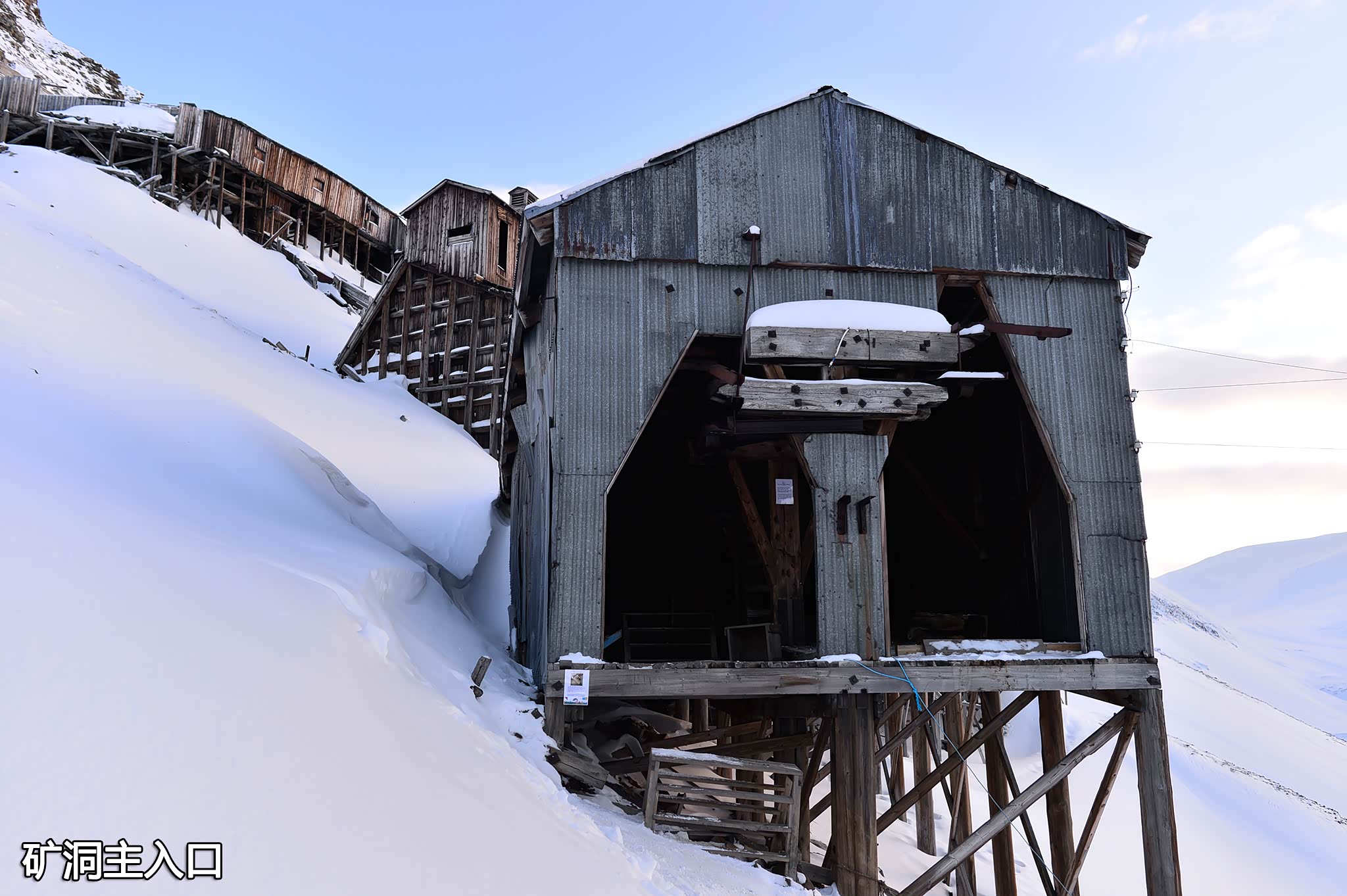 大厅一侧开口处是缆车的滑道入口,矿洞所有者大挪威斯皮策卑尔根煤炭公司在这里贴着英/挪文告示,大意介绍了该矿洞自1937年至1968年运营,现在是受保护的文化遗产,来到这里的游客需自己承担风险。