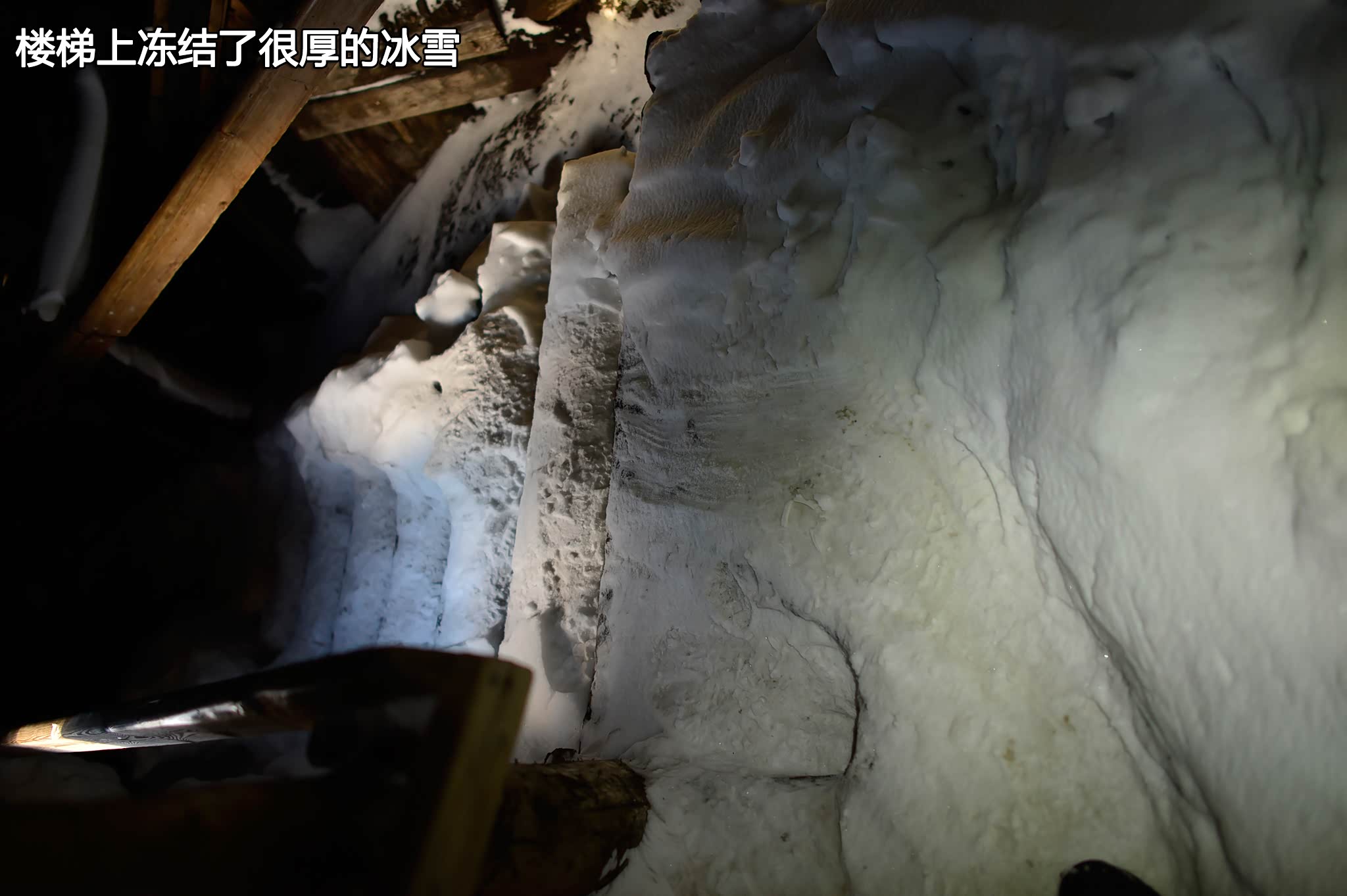 据说这个矿洞深达数公里,但是我们找了几条通道都被积雪或坚冰封堵了,不知道是季节不对还是因为安全原因被人为阻塞了。我们返回L型入口想去下层看看,楼梯上冻结了很厚的冰雪,非常湿滑,几无踏脚之地,有些地方已经完全看不见木楼梯踏板了,以往的访客在冰雪上凿出一些落脚点。我和李佳十分小心的慢慢下行,接近底部时遇到了一对来自德国的女游客,她们说下面才是这个矿洞的主入口。