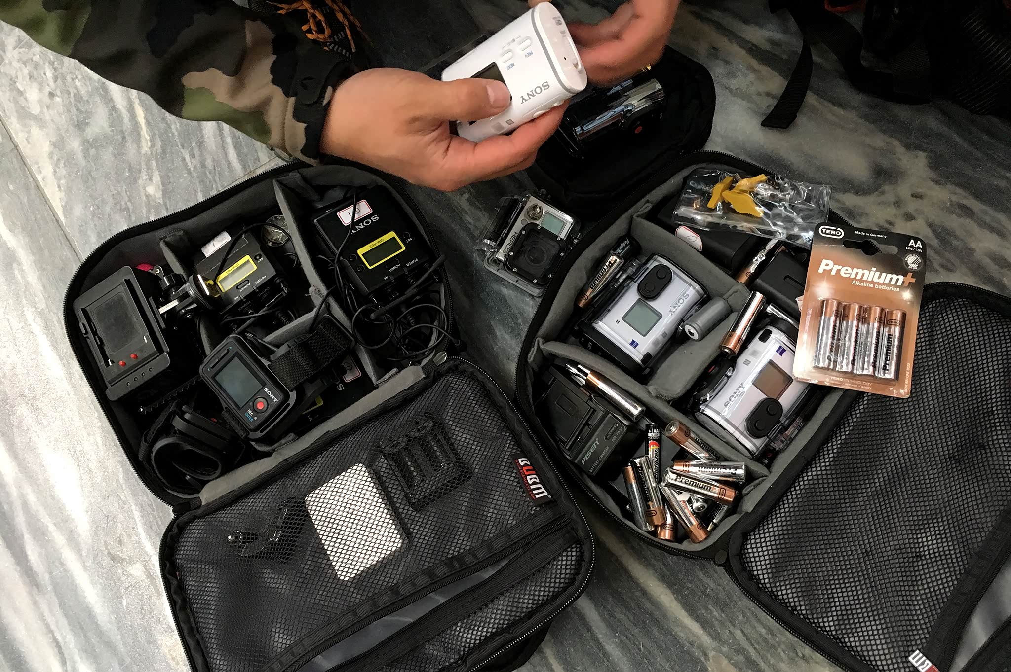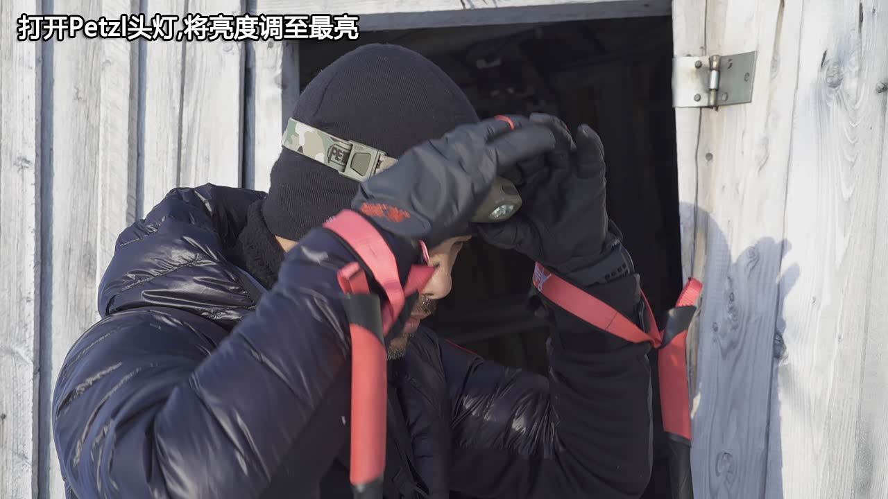 相比野外城里要暖和得多,因为要登山,不能再穿着适配滑雪板的雪靴了,我套上内部植绒的Salomon Toundra Pro CSWP Boot高腰靴,表面是有防水功能,我将Norrona Trollveggen Gore-Tex Pro Shell Bib Pants背带裤裤脚内衬套在靴腰上并将挂钩勾在鞋带上,自以为已经穿戴妥当。在胸部佩戴好视频组需要的摄录设备就出发了,不久我就开始后悔没在小腿上穿上雪套,攀登需要持续地高抬腿,这使在山下穿戴妥当的裤脚内衬逐渐脱离了靴腰,在没小腿的雪中跋涉时会往靴里灌雪。