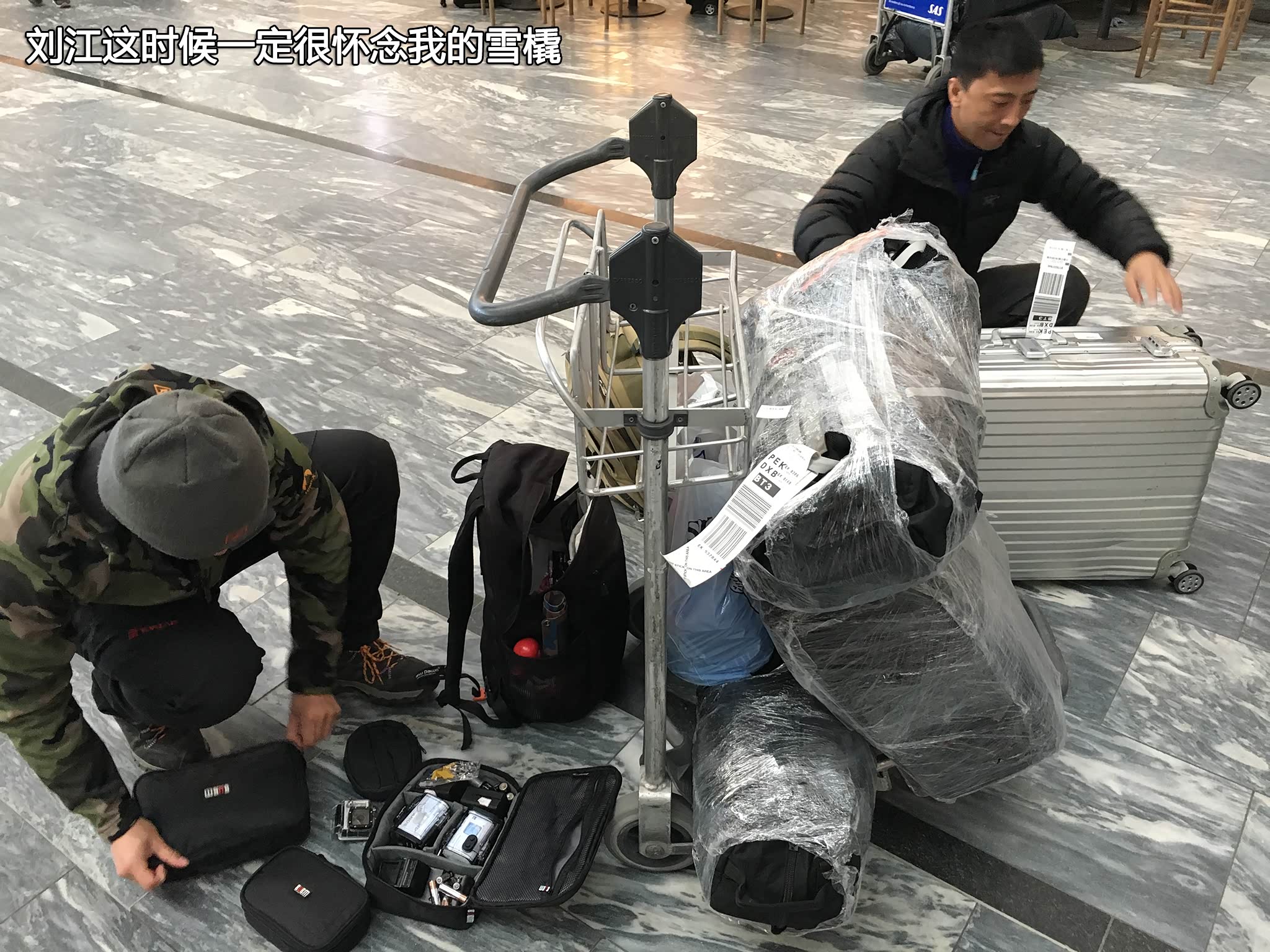 在奥斯陆机场托运行李时,刘大导演终于瞒不住了,工作人员说行李超重了,当时塞到我雪橇里的两个大包过秤时重量超过了25公斤,所以野外后两天实际上我拖带的装备超过了75公斤。刘大导演只好尴尬地说觉得头两天我看起来不够累,感觉表情不够狰狞,拍出来不够刺激,这可是爬山不是在走平路啊,刘导看来忘了自己拖着15公斤时就累得想骂人了,没办法只好帮他们分担行李过了托运这一关。
