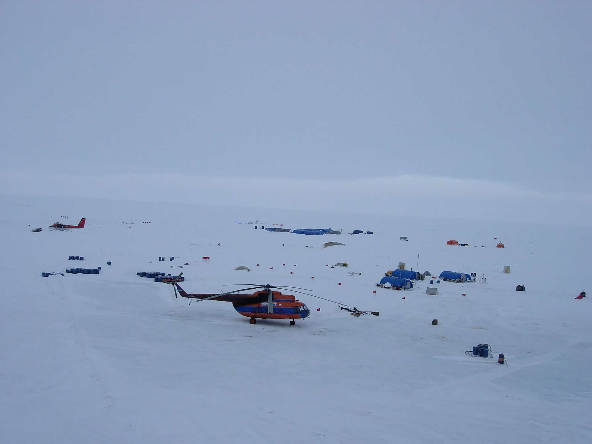 位于北纬89°东经100°的Barneo Base(巴涅奥冰上基地)是北极科考和探险的桥头堡,始建于2002年,从那时起每年四月都会重建一次。每年三月末会有2架直升机从俄罗斯西伯利亚西北部城市Norilsk诺里尔斯克长途飞行至北纬89°,在这里搜寻坚硬并足够大的浮冰,足够在其上建立长度至少达到1公里的冰上跑道。之后固定翼运输机从莫斯科将救援队伞兵、燃料、帐篷和小型拖拉机使用降落伞空投至此处,建立跑道和前行基地。如果冰上跑道出现了小型裂缝或孔洞,基地人员会浇水使其冻结修复跑道表面。