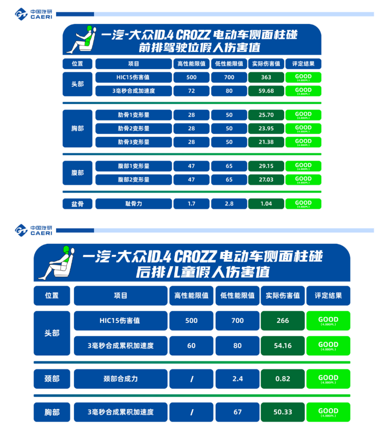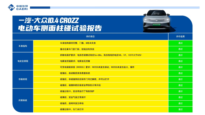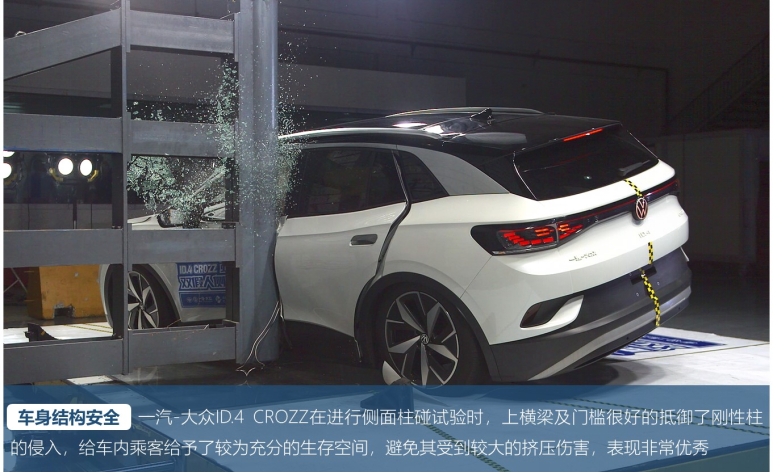 此次测试分为车身结构、电安全表现、功能表现及约束系统四项评价维度,根据测试结果显示, 一汽-大众ID.4 CROZZ ( 参数 | 询价 ) 顺利通过此次双假人侧面柱碰试验,现根据测试结果进行详细解读。
