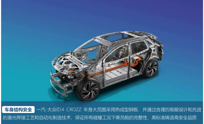 从车身结构来看,一辆车要足够安全,需要“软硬结合”。“硬”是为了在发生碰撞时保持完整的结构,不至于受撞击变形缩小,侵害车内乘员。“软”则是为了应对碰撞时产生的强大动能,如果这股力量不能被车身所吸收,就会传导至人体。一汽-大众ID.4 CROZZ采用“钢+铝”混合车身结构设计,2000mpa超高强度热成型钢,强度比传统热成型钢高25%,既保证了足够的车身强度和刚度,也能够溃缩吸能。值得一提的是,ID.4 CROZZ增加了侧位双全铝门槛,这也带来了更强的能量吸收保护。