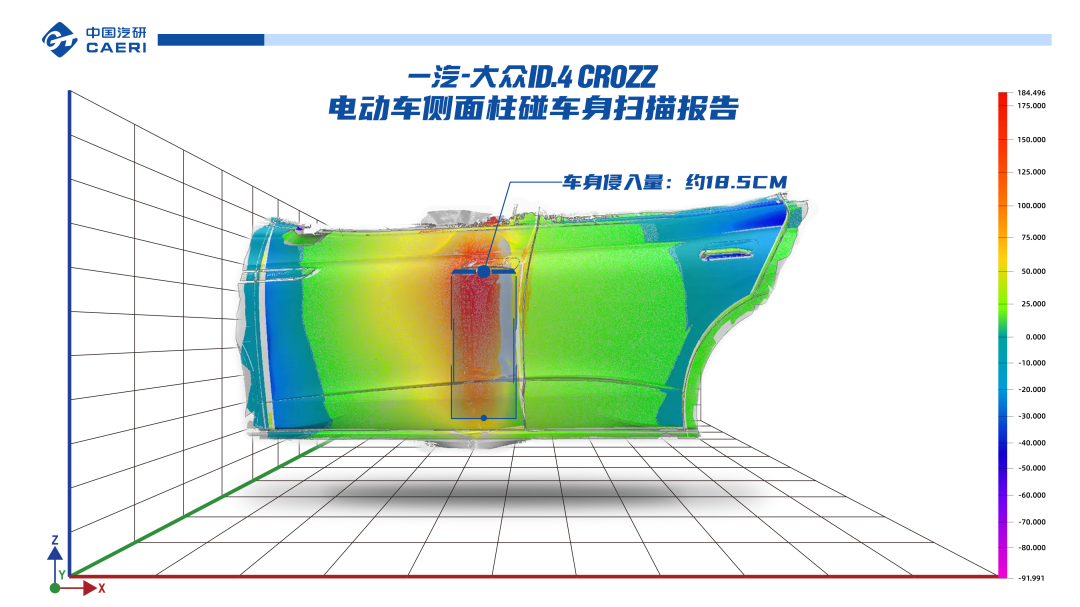 根据试验扫描报告显示,一汽-大众ID.4 CROZZ在侧面柱碰试验完成后,车身侵入量约为18.5CM,门槛侵入量为4.55CM。