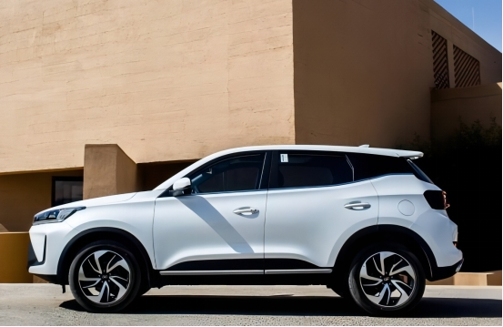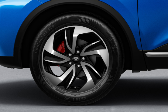 车身侧面,悬浮式车顶的既视感加上双层腰线设计让整车看起来很有力量感。刀锋式轮圈加上红色运动卡钳动感十足。
