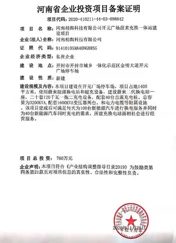 蔚来汽车提供给红星资本局的资料显示,该处充换电站项目由河南相舆科技有限公司建设,总投资760万元,占地1400平方米,包括20套120千瓦一拖二充电设备和40台直流充电桩,建成后每天可满足100台新能源汽车进行换电服务,同时为40台新能源汽车充电的需求。所建充电站面向社会进行经营服务。