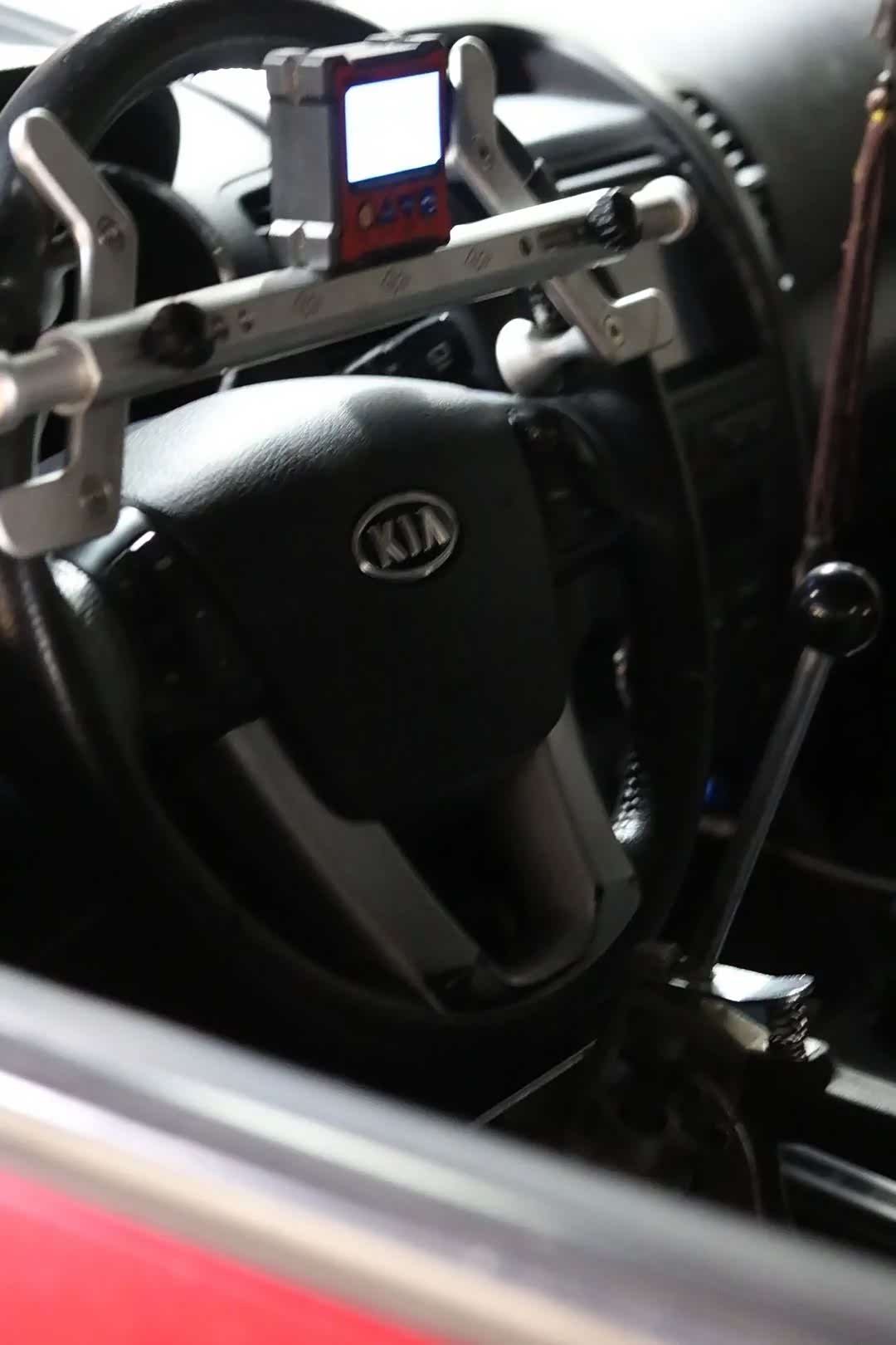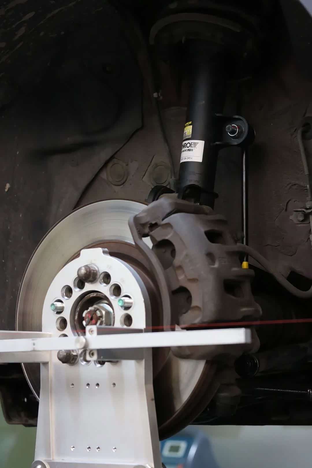接着进行四轮拉线定位,方向盘数值锁定中,准备调整底盘数据。